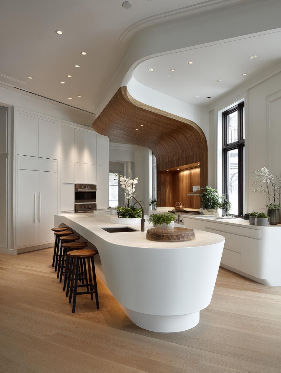Curved walnut wood panels flow seamlessly from ceiling to backsplash, forming an architectural canopy that transforms this minimalist white kitchen into a showstopping space. The organic wood element contrasts beautifully against crisp white cabinetry and the striking curved island base. Natural light streams through black-framed windows, illuminating potted orchids and herbs that soften the contemporary lines throughout.