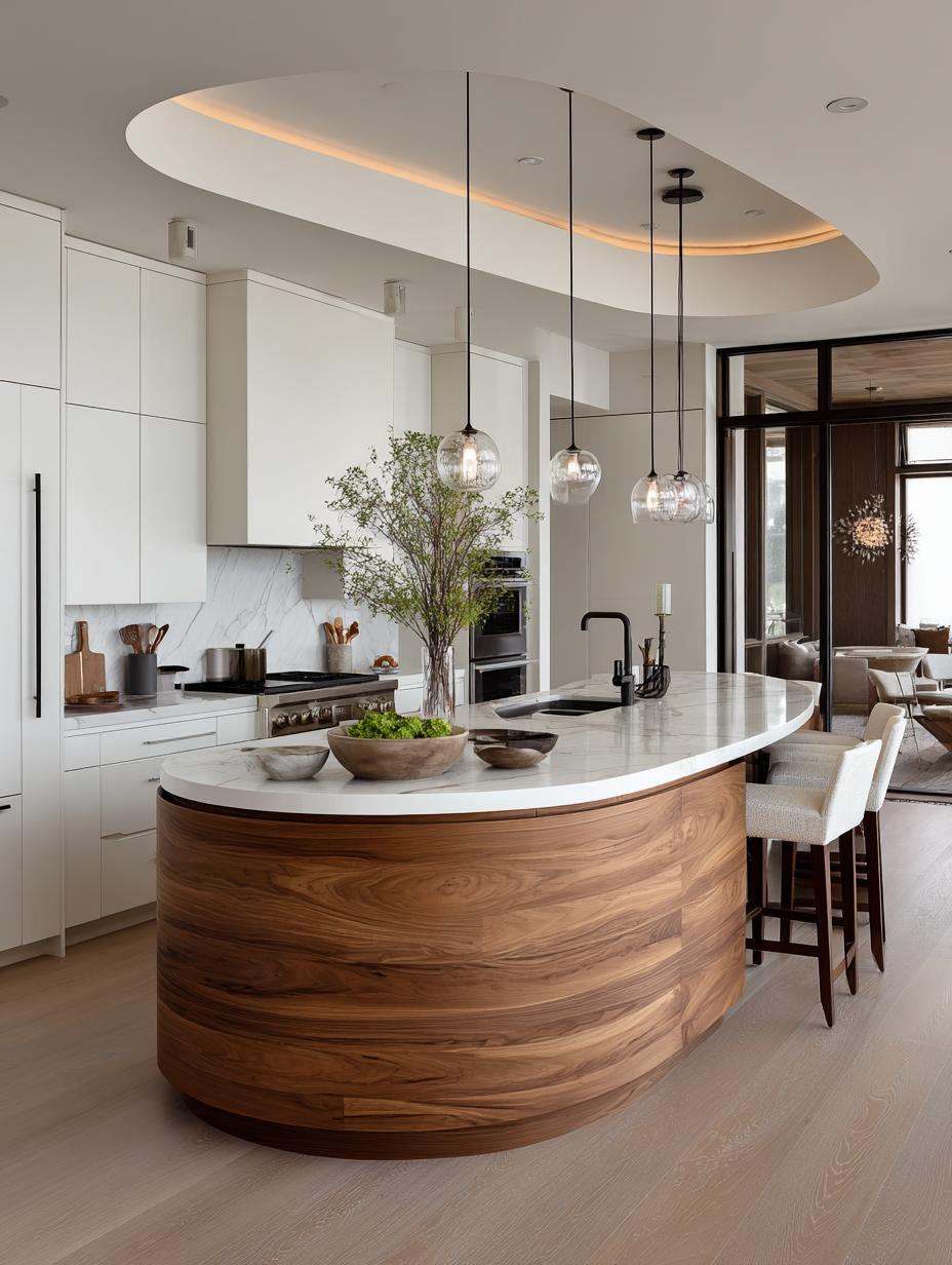 Curved Walnut Island Anchors Contemporary White Kitchen Excellence