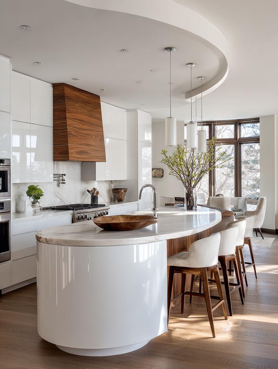 Walnut wood cabinetry creates stunning contrast against glossy white surfaces in this sophisticated kitchen design. The curved island flows seamlessly beneath a sculptural ceiling detail, while pendant lights illuminate the workspace below. Natural light streams through dark-framed windows, highlighting the rich wood grain and polished countertops. Bar stools with cream upholstery soften the space’s modern edge.
