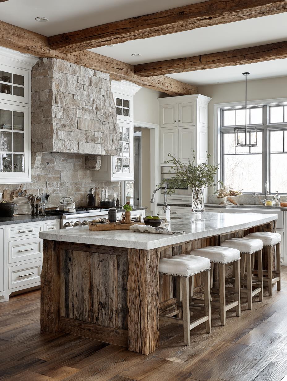 Weathered reclaimed wood transforms this white kitchen into a stunning focal point, creating dramatic contrast against crisp cabinetry and natural stone. Exposed ceiling beams echo the island’s rustic character while polished countertops add sophisticated shine. White upholstered stools soften the raw wood textures, and large windows flood the space with natural light that highlights every architectural detail beautifully.
