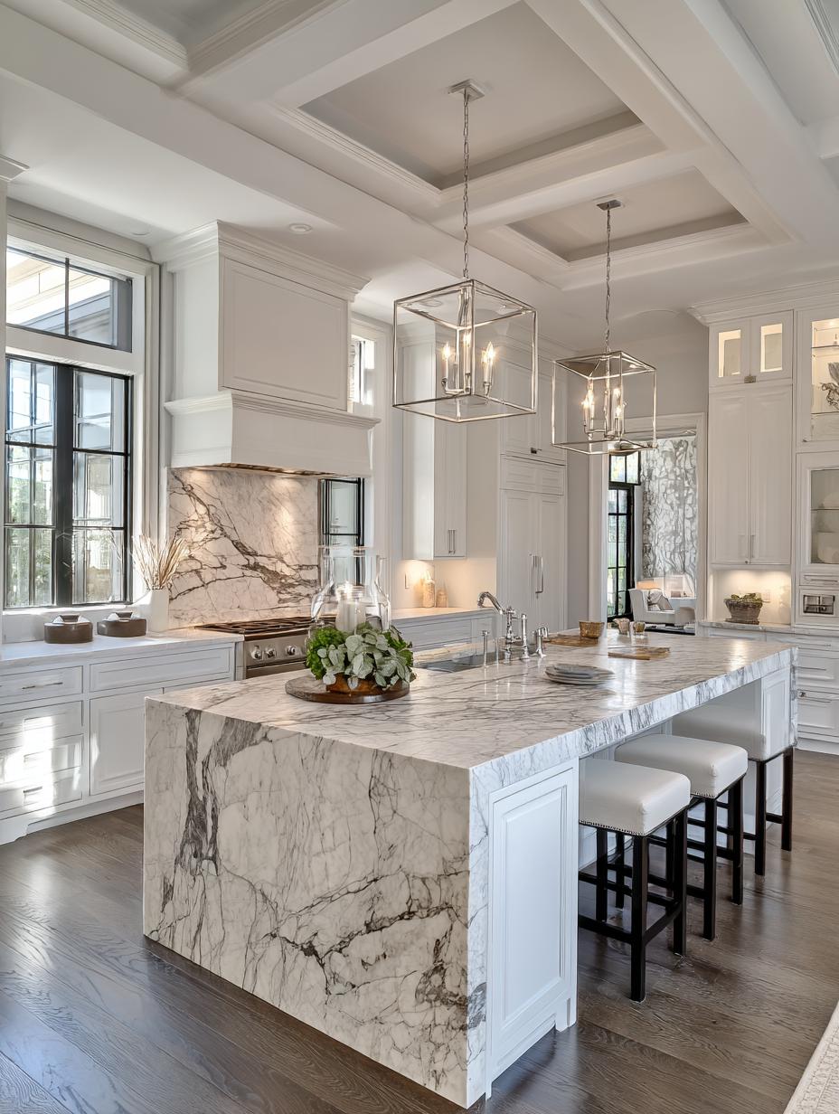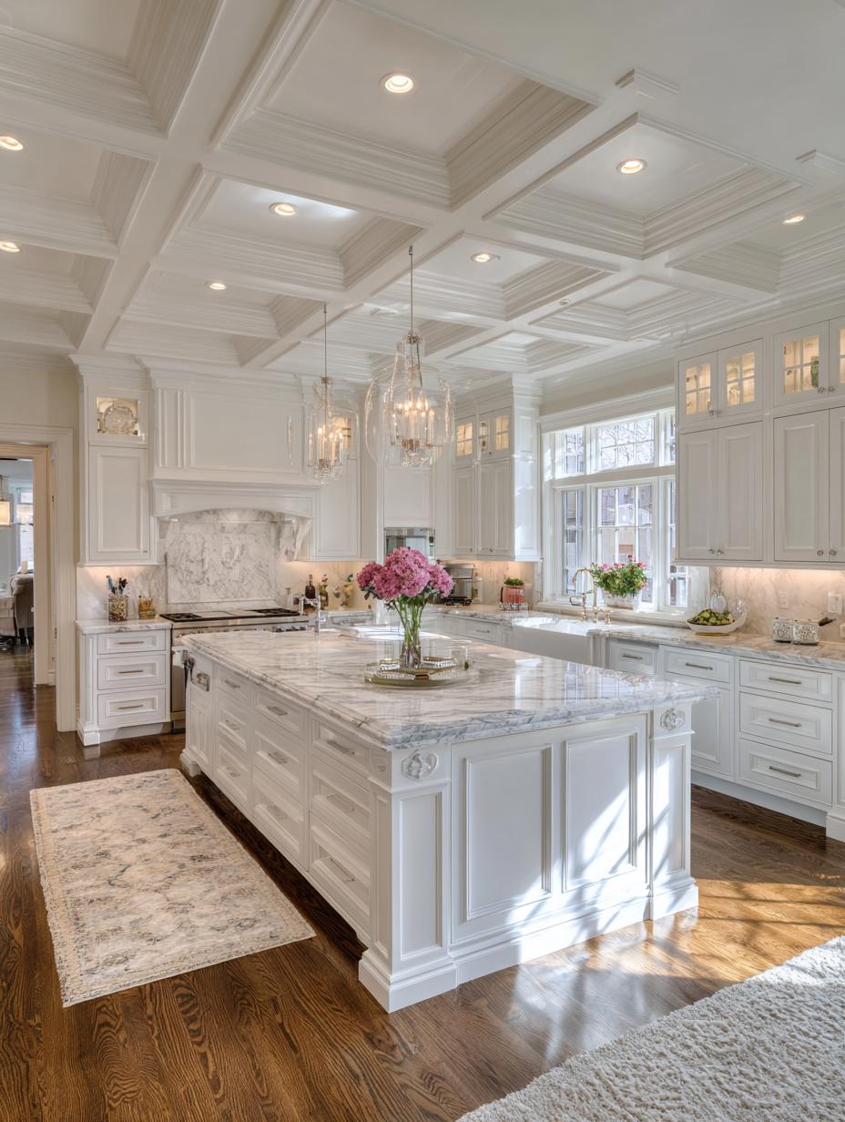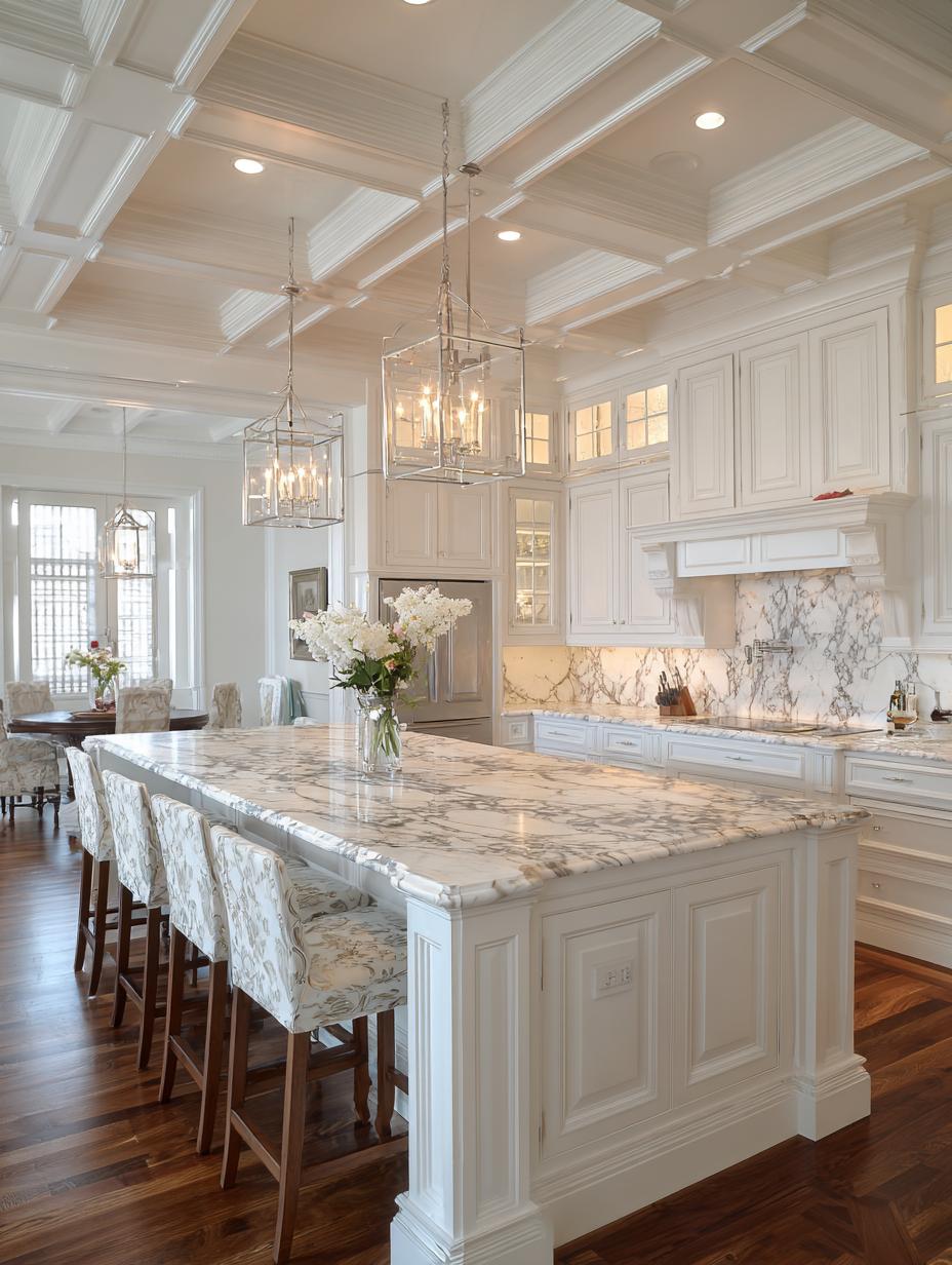 Coffered Ceiling Elegance Meets Marble Island Sophistication
