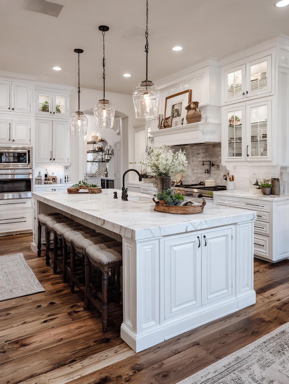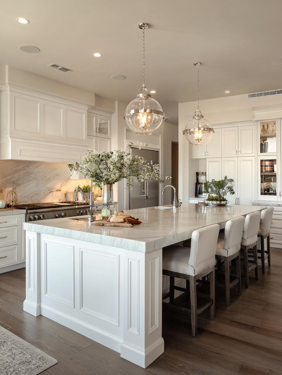 Crisp white cabinets stretch from floor to ceiling, maximizing storage while maintaining an airy feel throughout this spacious kitchen. Clear glass pendant lights dangle above the expansive marble-topped island, where rustic wooden bar stools provide casual seating. Rich hardwood floors ground the bright palette, while decorative baskets and greenery add organic warmth to the pristine surfaces.