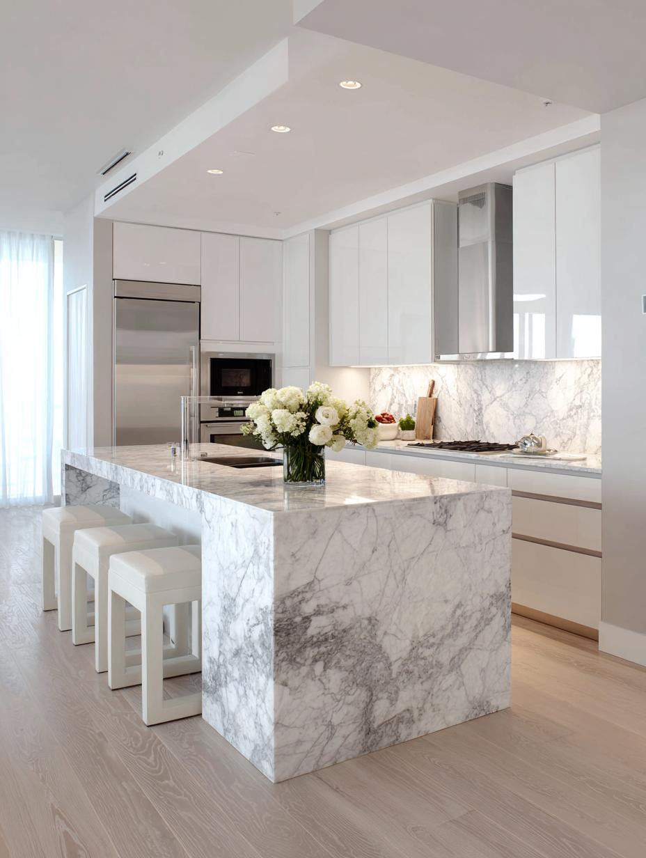 Marble Waterfall Island Commands Contemporary White Kitchen Excellence