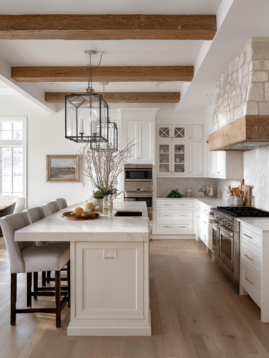 Exposed Beam Elegance Meets Crisp White Cabinetry