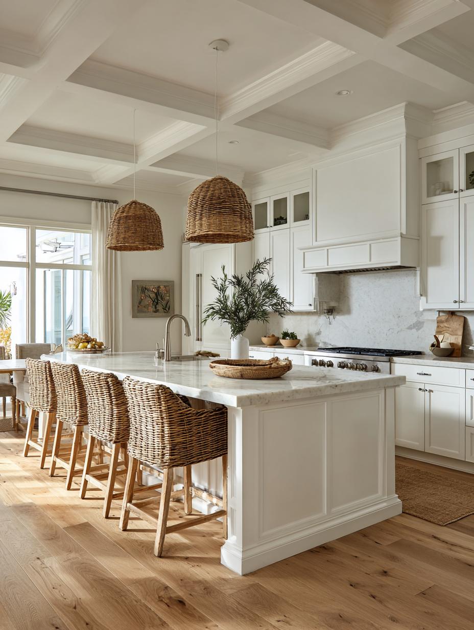 Woven rattan pendant lights cascade over a pristine marble waterfall island, creating perfect task lighting for meal prep and casual dining. Natural textures dominate through wicker counter stools with sleek wooden legs, while coffered ceilings add architectural sophistication to crisp white cabinetry. Wide-plank oak floors ground the space with warmth, complementing the marble backsplash and integrated range hood for seamless coastal luxury.