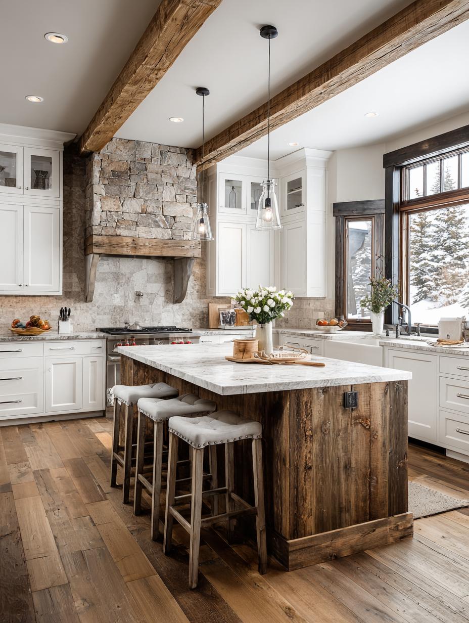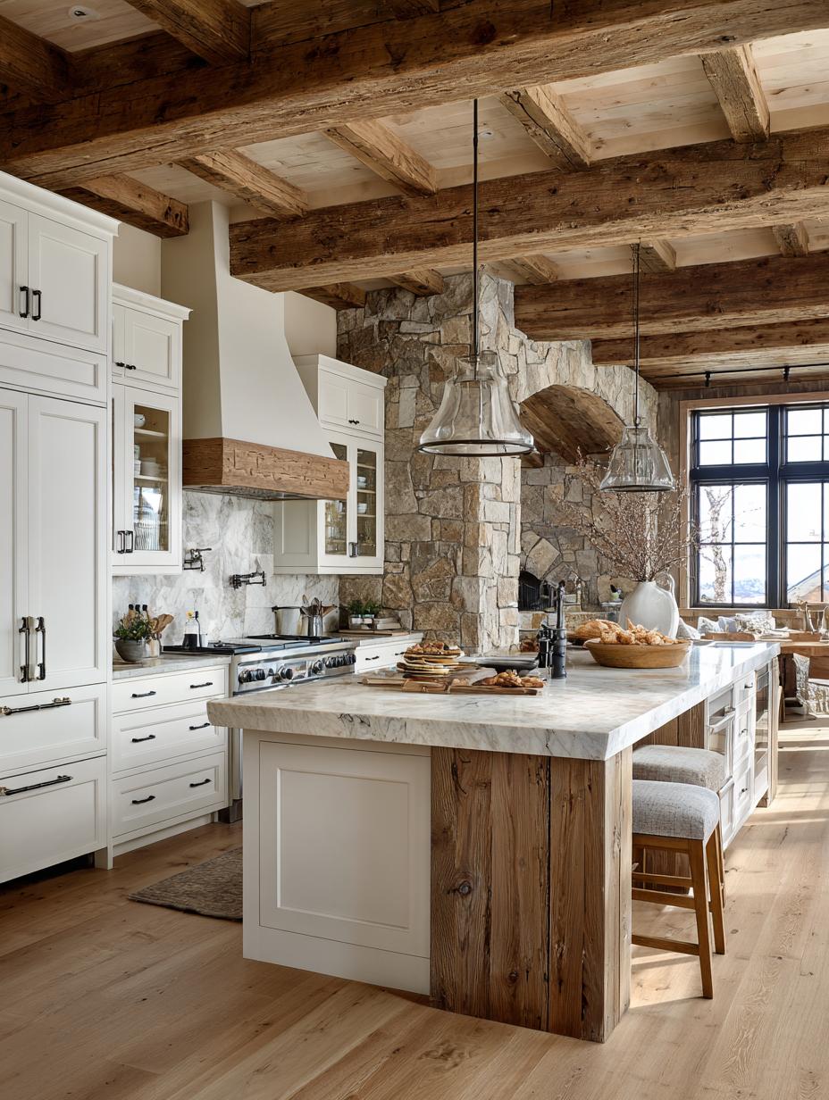 Rustic Beams Meet White Cabinetry in Mountain-Inspired Farmhouse Design