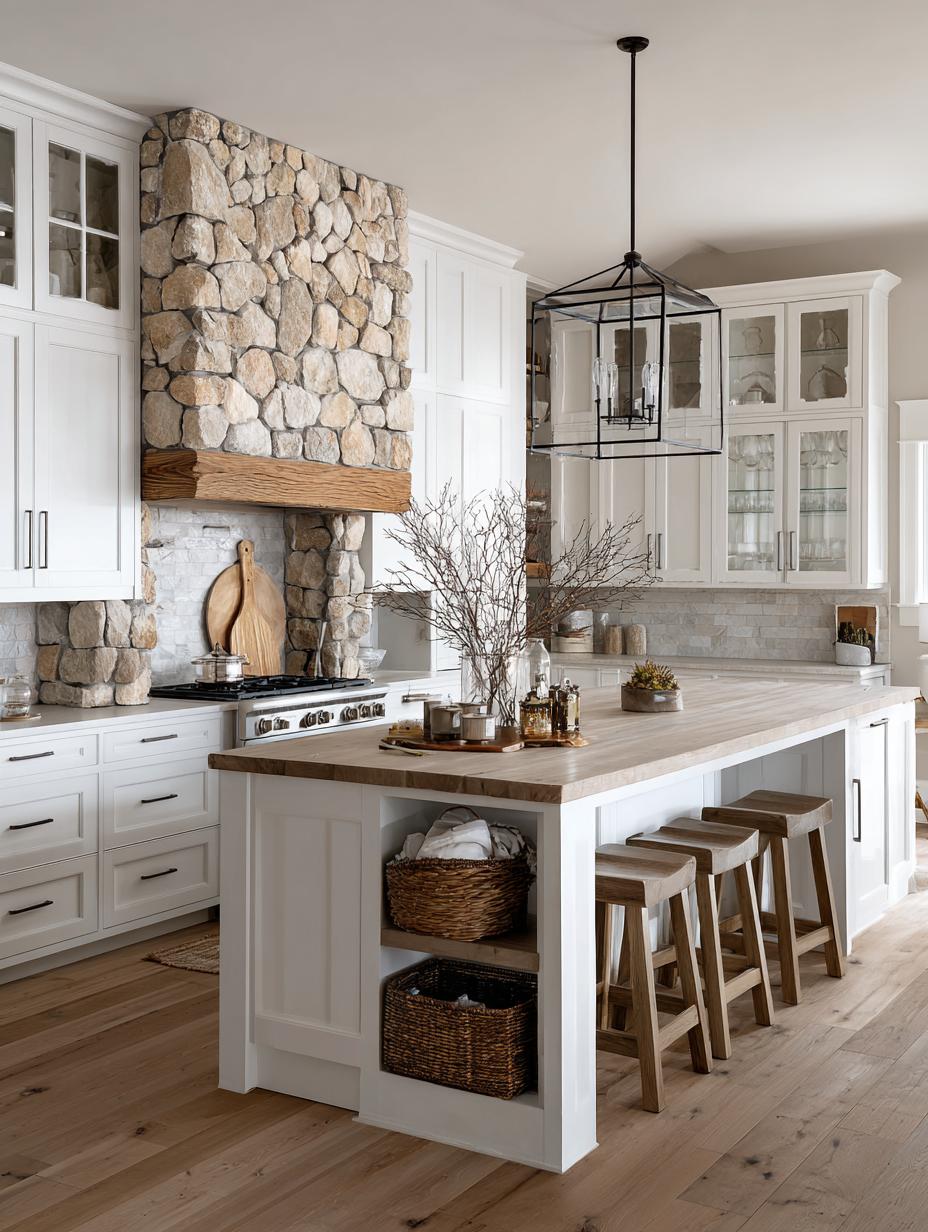 River rock creates a stunning accent wall that extends from floor to ceiling, anchoring this bright white kitchen with organic texture. Natural wood bar stools complement the reclaimed timber mantel, while black lantern pendant lights add industrial contrast. Glass-front cabinets showcase dishware collections, and woven baskets tucked beneath the island provide stylish storage solutions that maintain the space’s clean lines.