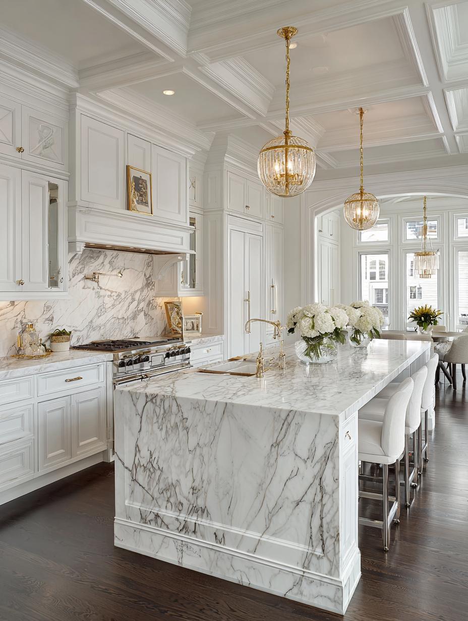 Coffered Ceilings Meet Calacatta Gold in Timeless Traditional Design