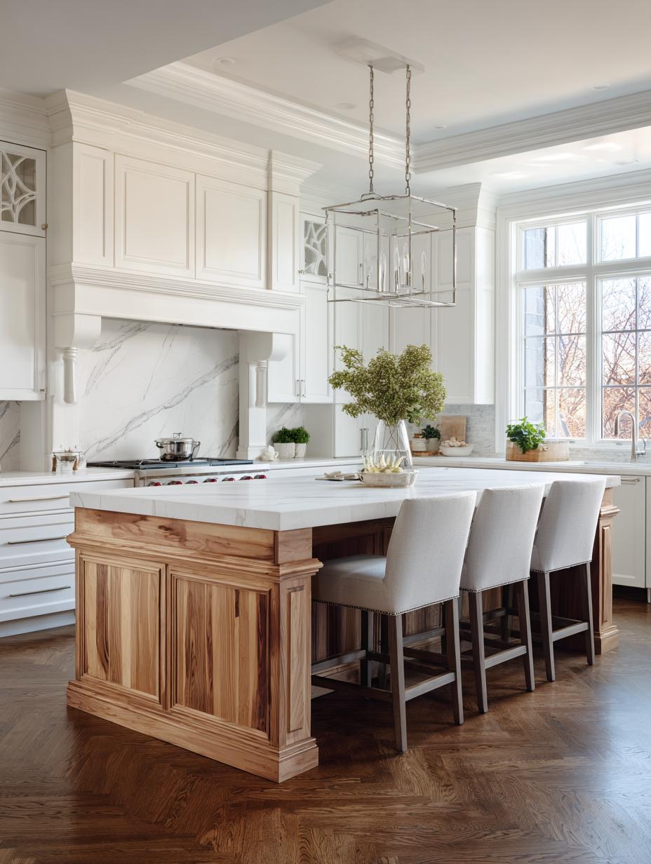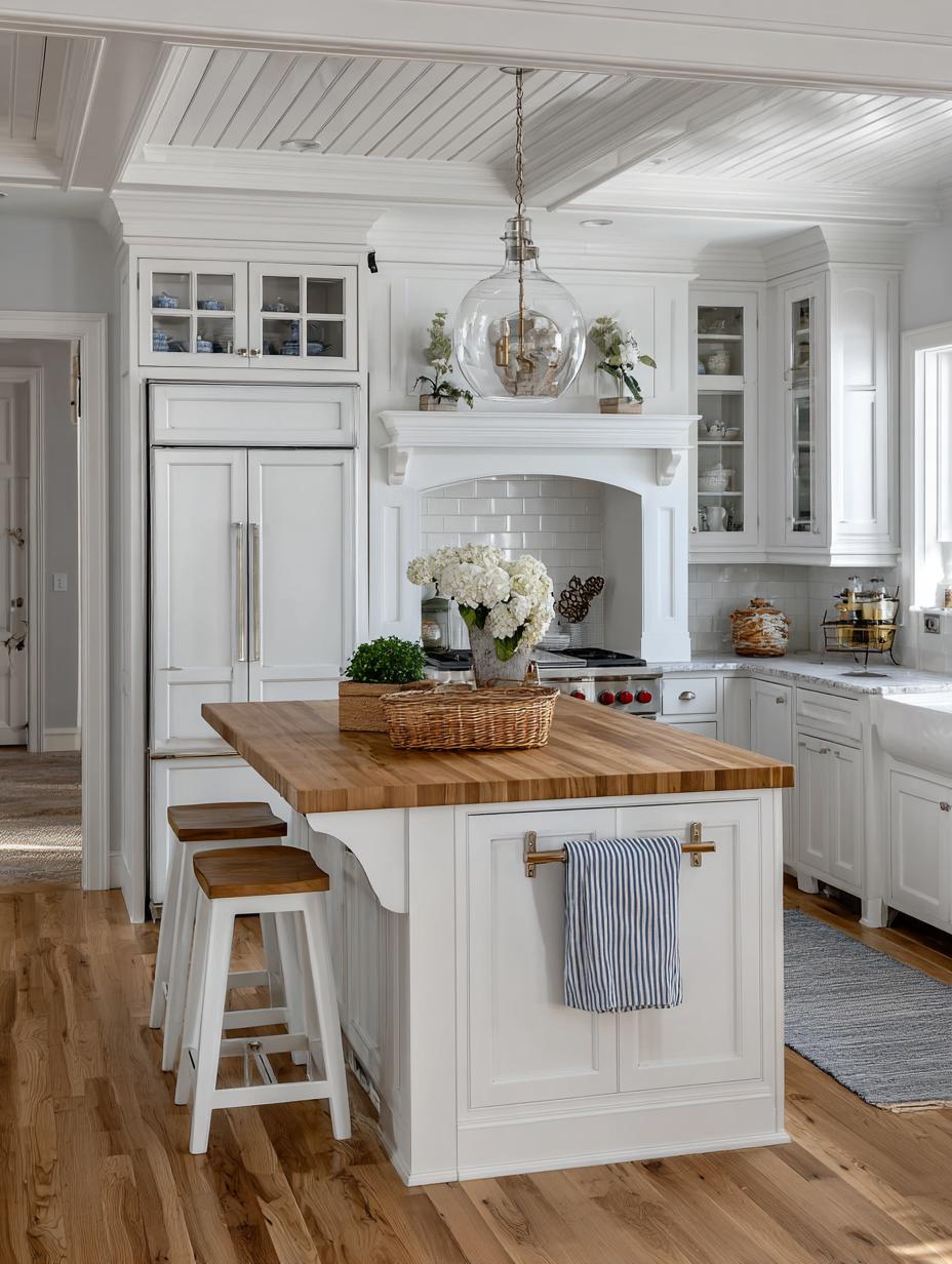 Reclaimed Wood Island Creates Stunning Contrast in Crisp White Kitchen