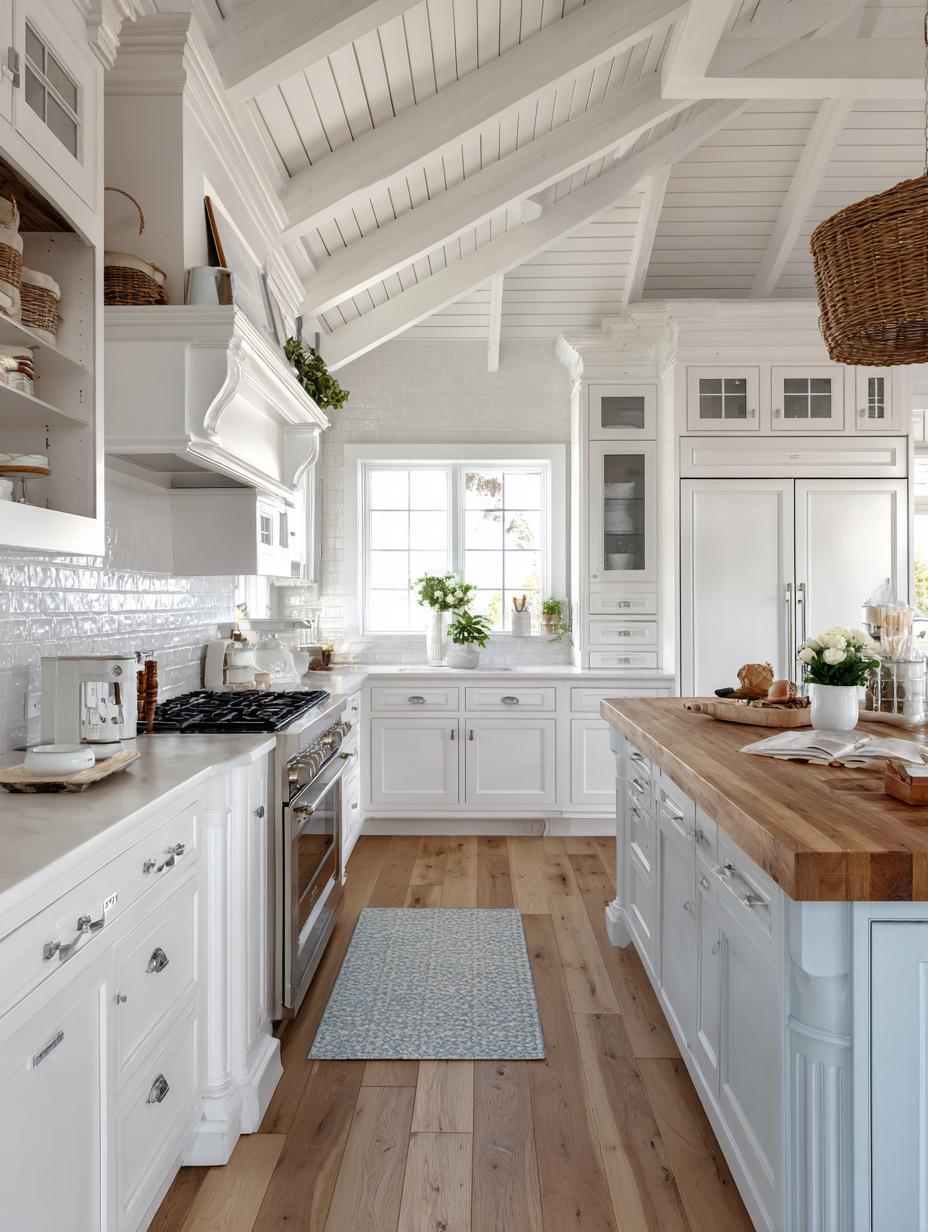 Natural wood beams create dramatic architectural interest above this pristine white kitchen, while butcher block countertops add warmth against crisp cabinetry. Subway tile backsplash extends to the ceiling, maximizing vertical space and light reflection. Wicker storage baskets provide textural contrast on open shelving, while professional-grade appliances ensure this beauty works as hard as it looks stunning.