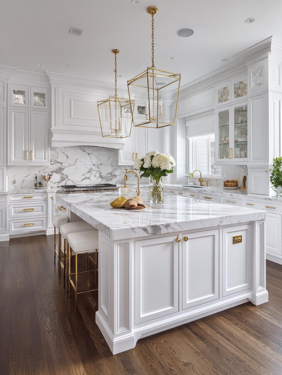 Gilded Geometry Meets Marble Majesty in Luxurious White Kitchen