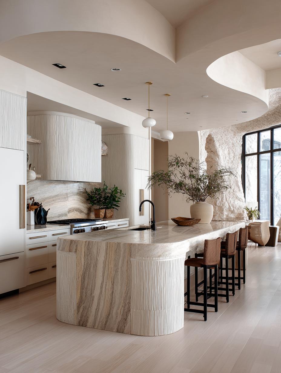 Dramatic curved ceiling elements create sculptural interest above this sophisticated kitchen island, where fluted wood cabinetry combines with book-matched marble countertops. Natural travertine walls add organic texture while warm wood bar stools provide comfortable seating. Brass pendant lights illuminate the workspace, and carefully placed greenery softens the modern architectural lines throughout the open-concept space.