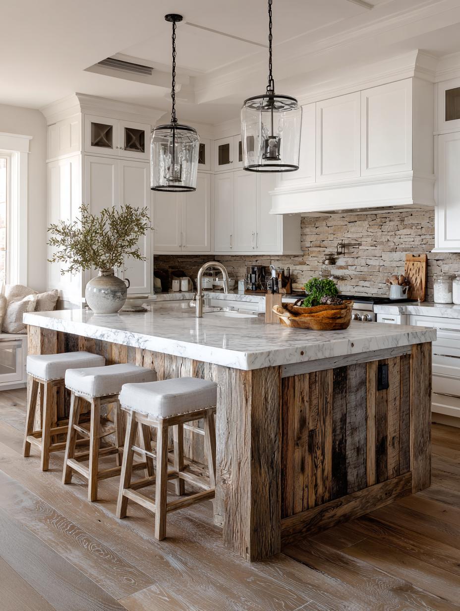 Reclaimed Wood Island Anchors Modern Farmhouse Elegance