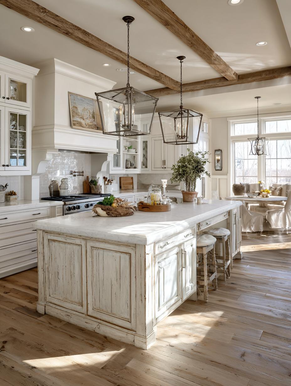 Weathered wooden beams stretch across vaulted ceilings, creating architectural drama above this pristine white kitchen. Lantern-style pendant lights cast warm illumination over a distressed island base that contrasts beautifully with smooth marble countertops. Glass-front cabinets showcase curated dishware while natural light floods through expansive windows, highlighting the rich hardwood floors that ground this sophisticated farmhouse design with authentic rustic charm.