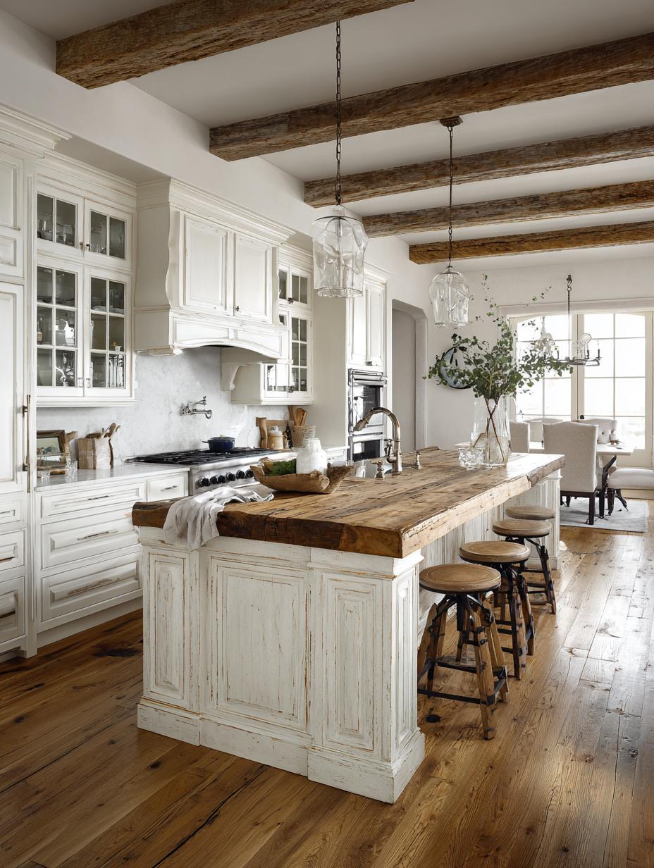 Rustic Beam Ceilings Meet Pristine White Cabinetry in Timeless Farmhouse Style