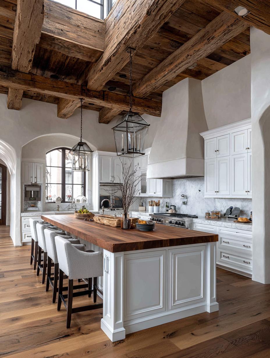 Reclaimed wood ceiling beams create dramatic contrast against crisp white shaker-style cabinetry in this sophisticated farmhouse kitchen. The thick butcher block island countertop anchors the space while glass-front upper cabinets display curated dishware. Industrial bar stools provide casual seating, and lantern-style pendant lights cast warm ambient lighting throughout the cooking zone.