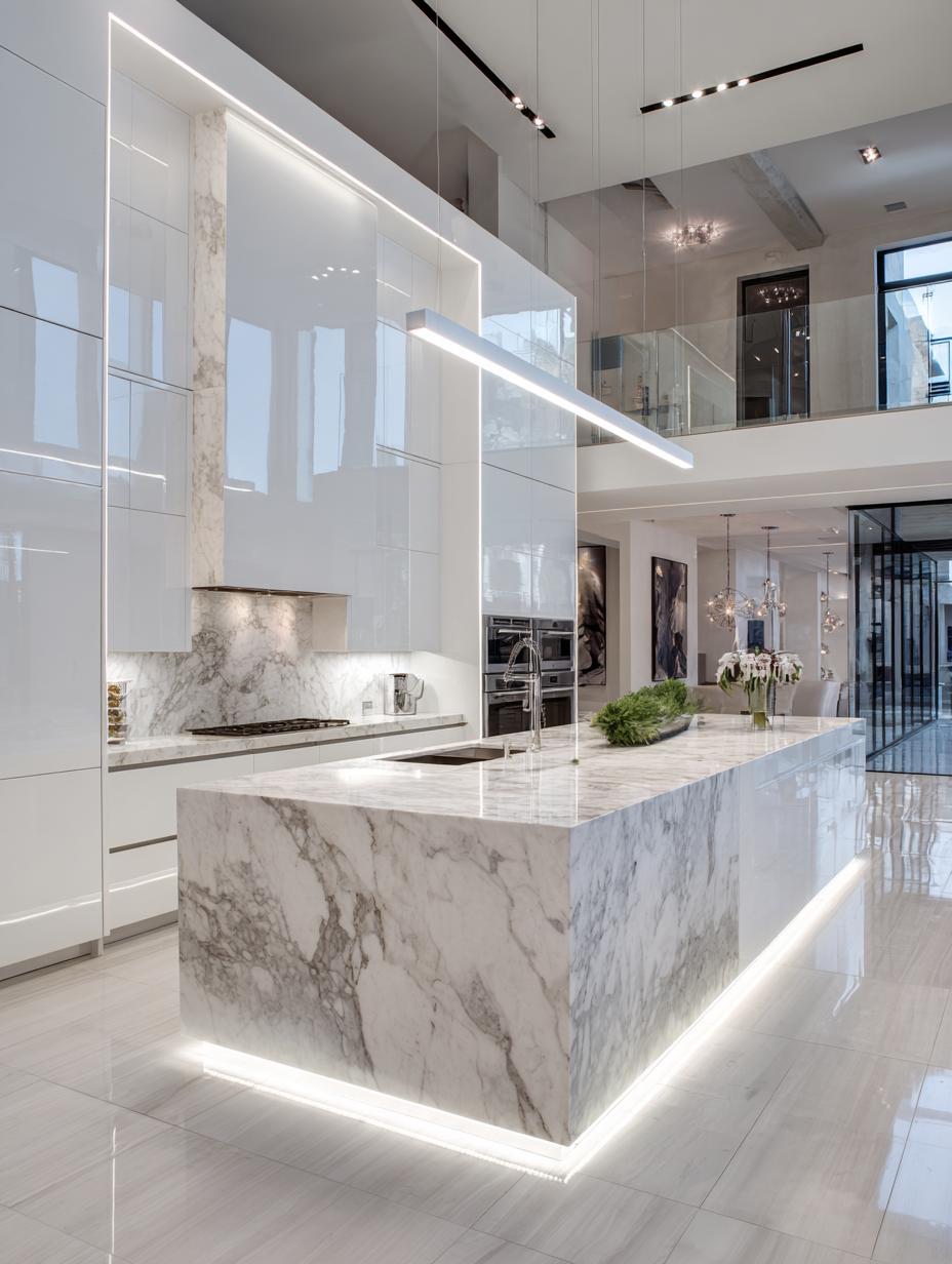 Dramatic veined marble creates a stunning waterfall edge island that anchors this sophisticated white kitchen. Sleek handleless cabinets extend to double-height ceilings, maximizing storage while maintaining clean lines. Under-cabinet LED strips and floating linear fixtures illuminate polished surfaces, while the marble backsplash continues the luxurious stone theme. Glass railings on the mezzanine level preserve sight lines and enhance the airy, gallery-like atmosphere.