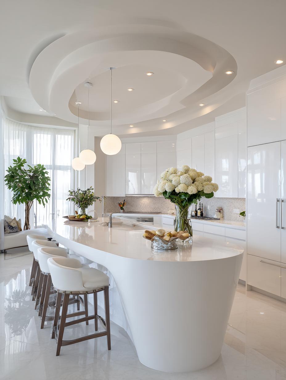Sculptural white quartz transforms this island into a flowing centerpiece that anchors the entire space. Dramatic circular ceiling details create visual depth while recessed lighting illuminates gleaming surfaces throughout. White lacquer cabinetry extends seamlessly from floor to ceiling, maximizing storage without overwhelming the room’s clean aesthetic. Cream leather bar stools provide comfortable seating while maintaining the monochromatic palette that defines this sophisticated design approach.