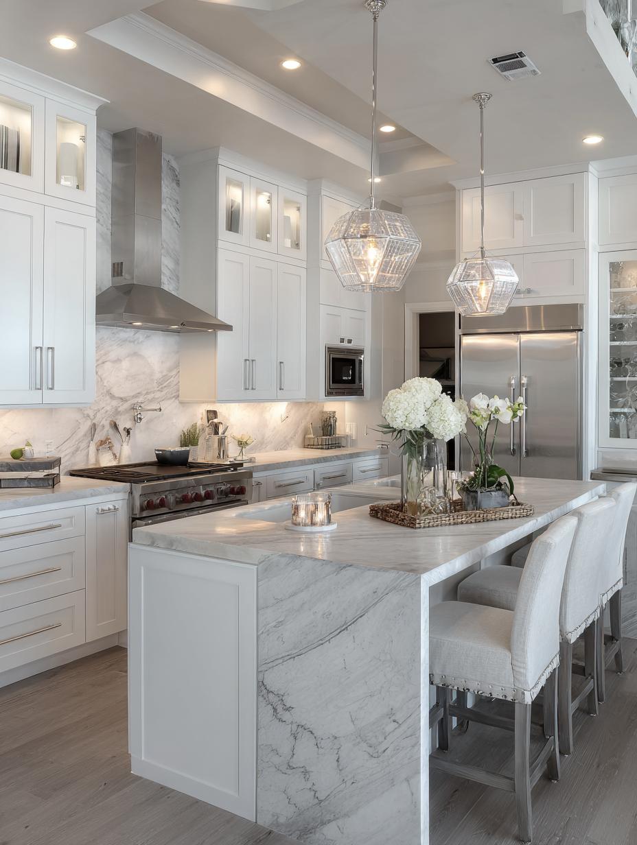 Marble Waterfall Island Commands This Luxurious Traditional White Kitchen