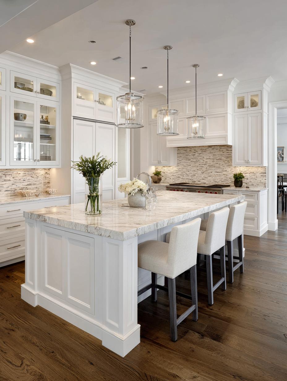 Dramatic veining flows across this stunning marble waterfall countertop, creating an impressive focal point that anchors the entire kitchen. White shaker cabinets with glass-front uppers showcase dishware while maintaining clean lines throughout. Three matching pendant lights provide focused task lighting over the expansive island, where upholstered counter stools offer comfortable seating. Warm hardwood floors ground the bright palette, while stone mosaic backsplash adds subtle texture between pristine cabinetry and countertops.