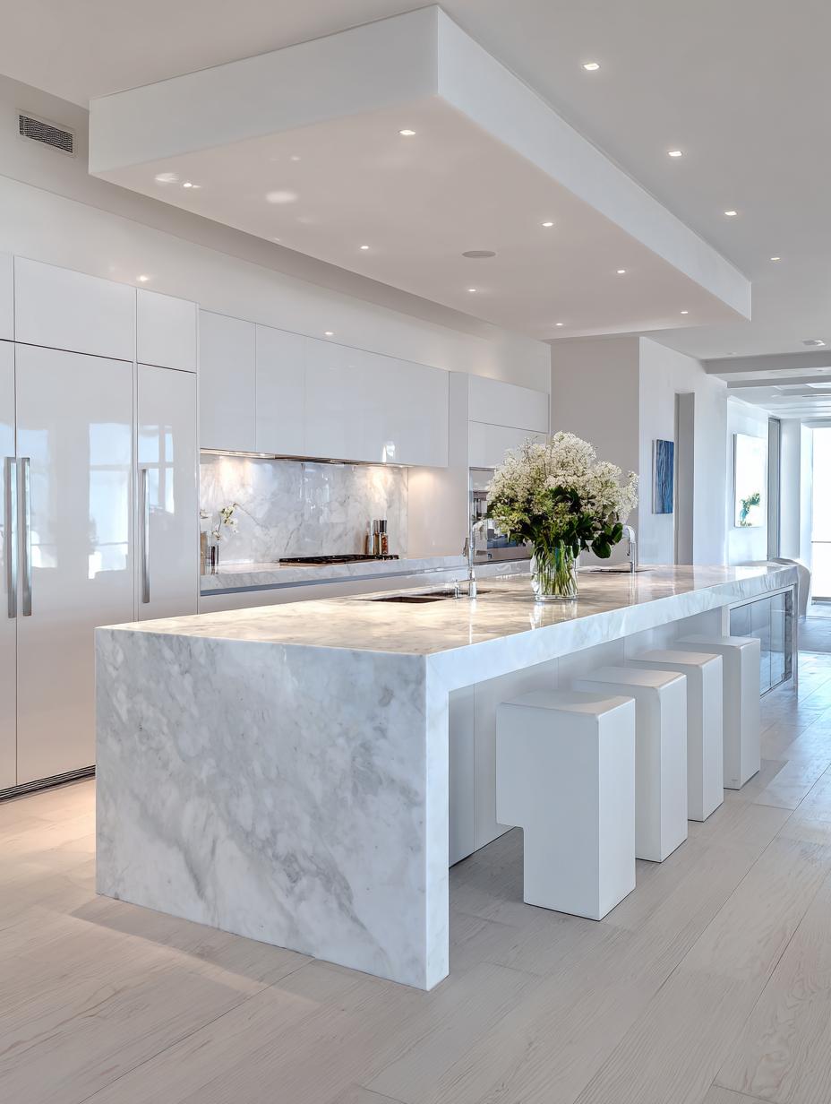 Marble Waterfall Islands Create Sculptural Drama in Minimalist White Spaces