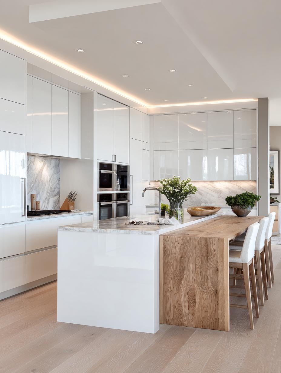 Glossy white lacquer cabinets stretch floor-to-ceiling, creating seamless storage walls that maximize vertical space. The waterfall-edge island combines pristine white quartz with rich oak wood paneling, establishing a stunning two-tone focal point. Hidden LED strips illuminate the perimeter ceiling while marble backsplashes add subtle veining. Modern white leather barstools complete this sophisticated entertaining zone.
