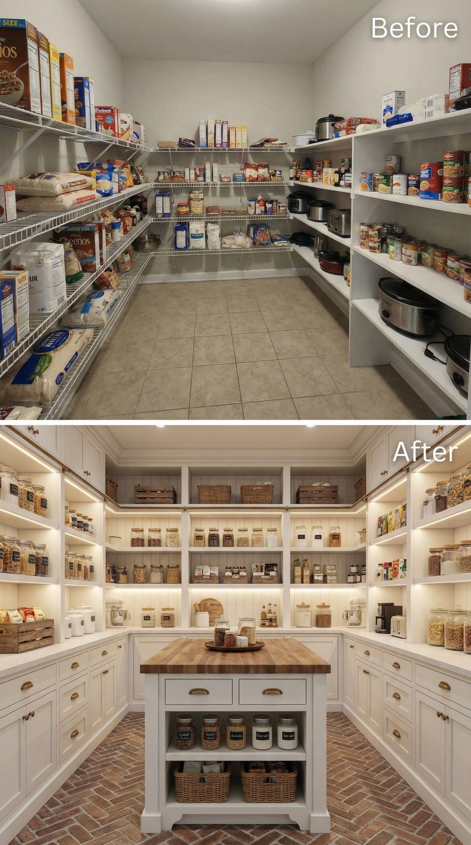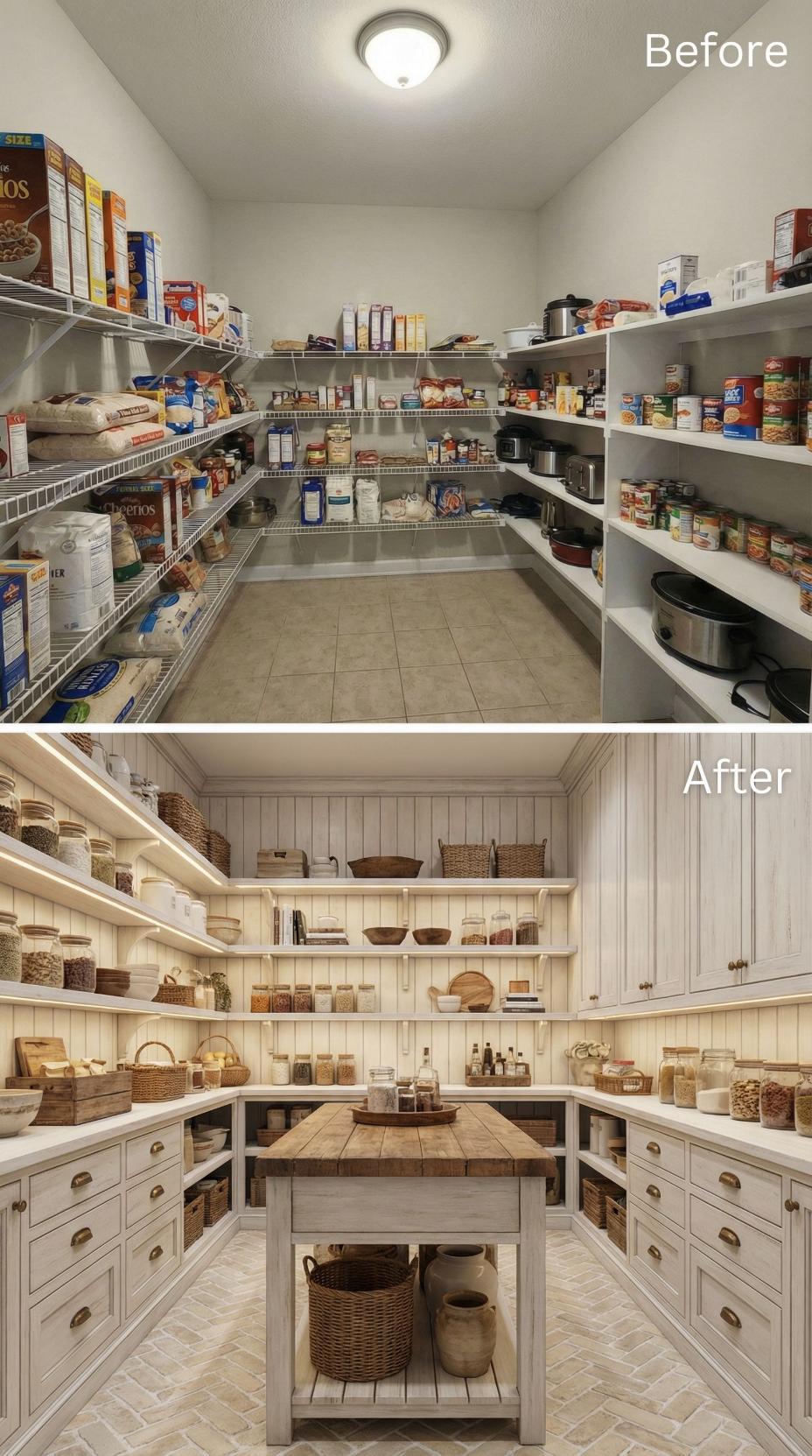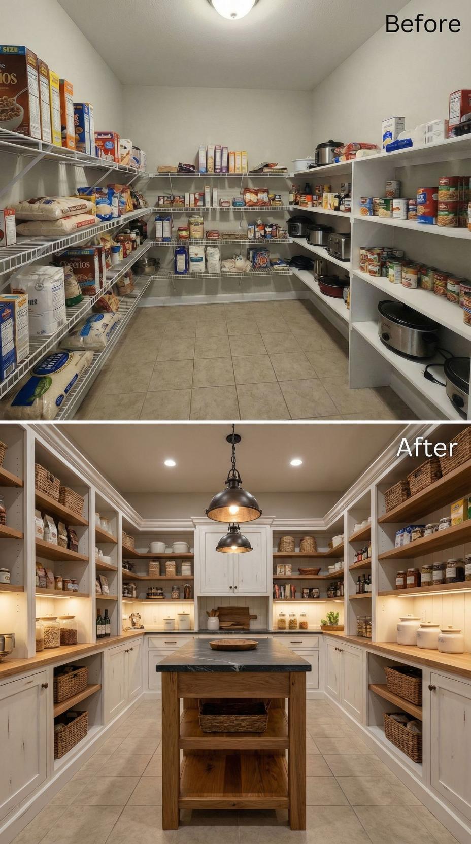 Wire shelving and mismatched containers give way to stunning white shaker cabinets with carefully labeled glass canisters and woven baskets. The transformation includes pendant lighting, butcher block countertops, and a central prep island that doubles as additional storage. Professional organization systems replace chaotic stacking, while warm wood flooring and strategic task lighting create an inviting workspace that rivals any chef’s dream pantry.