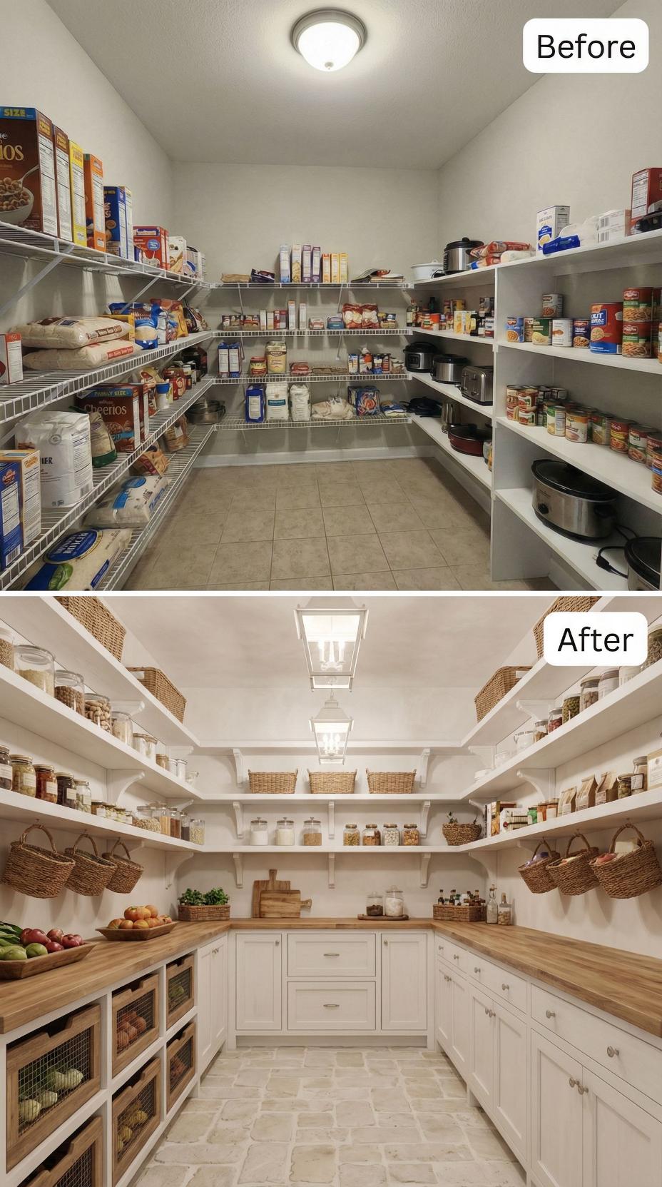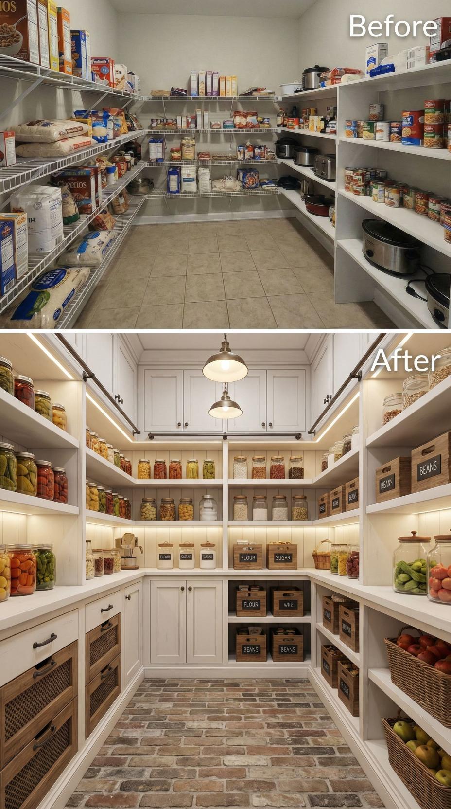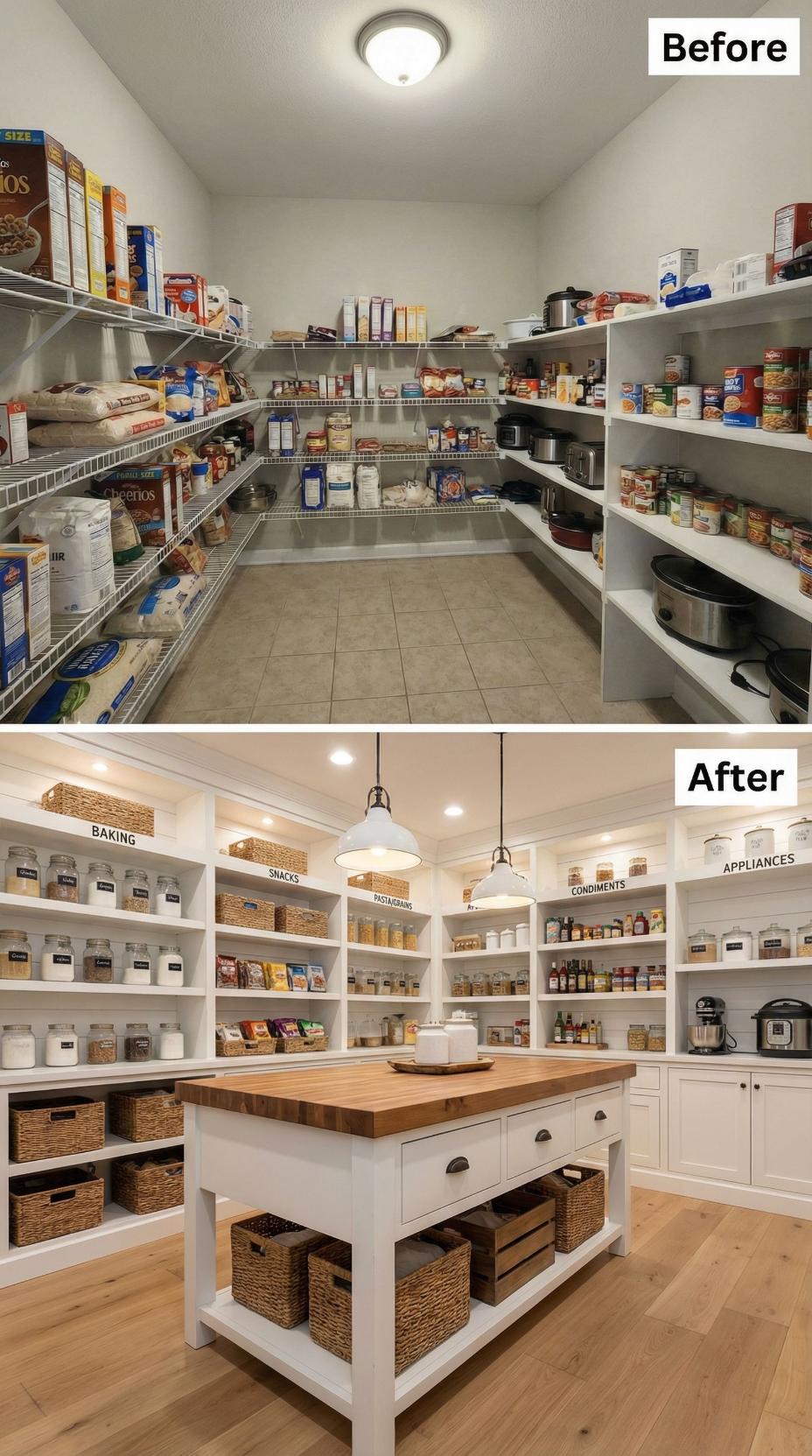 Wire shelving and mismatched containers give way to stunning white shaker cabinets with carefully labeled glass canisters and woven baskets. The transformation includes pendant lighting, butcher block countertops, and a central prep island that doubles as additional storage. Professional organization systems replace chaotic stacking, while warm wood flooring and strategic task lighting create an inviting workspace that rivals any chef’s dream pantry.