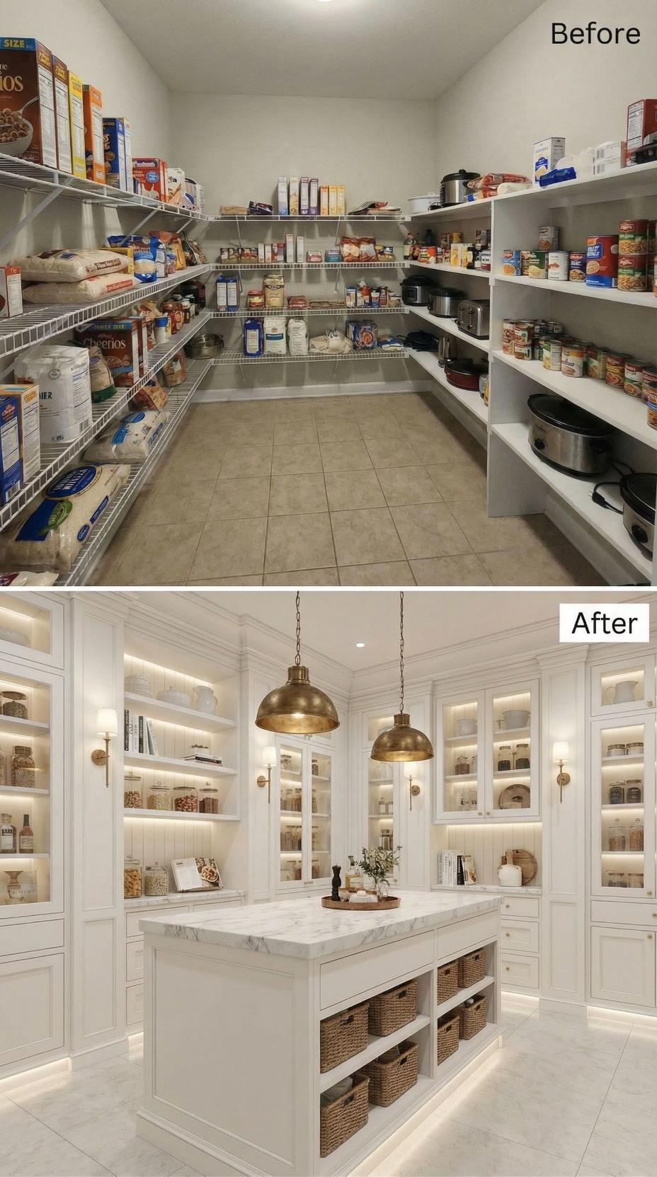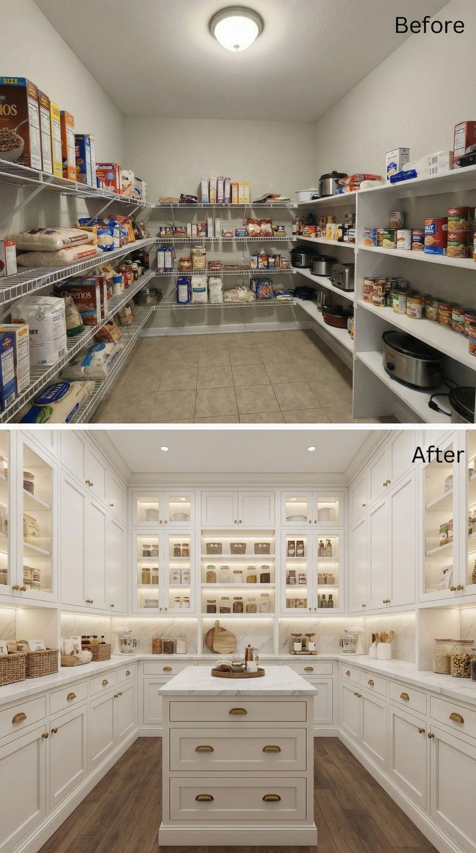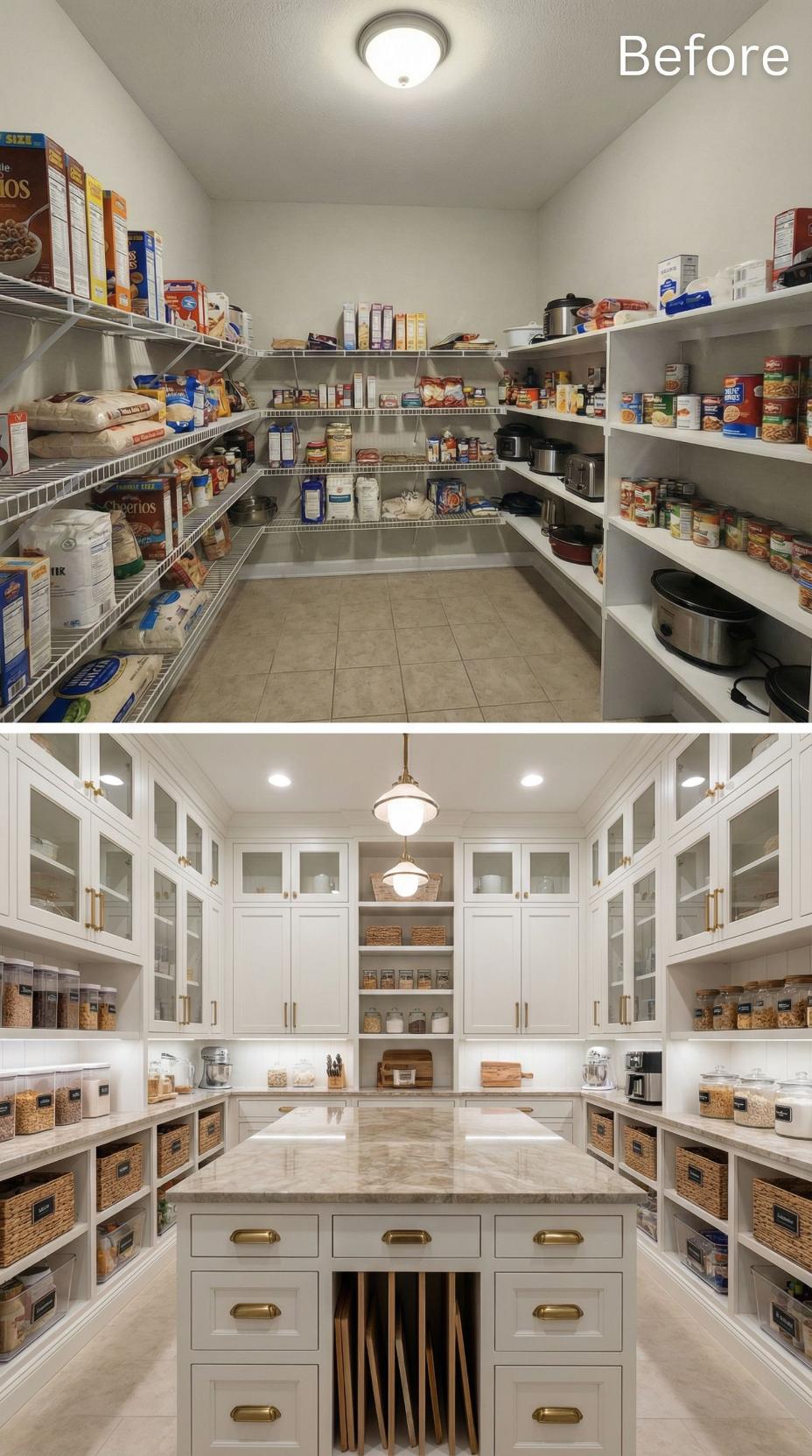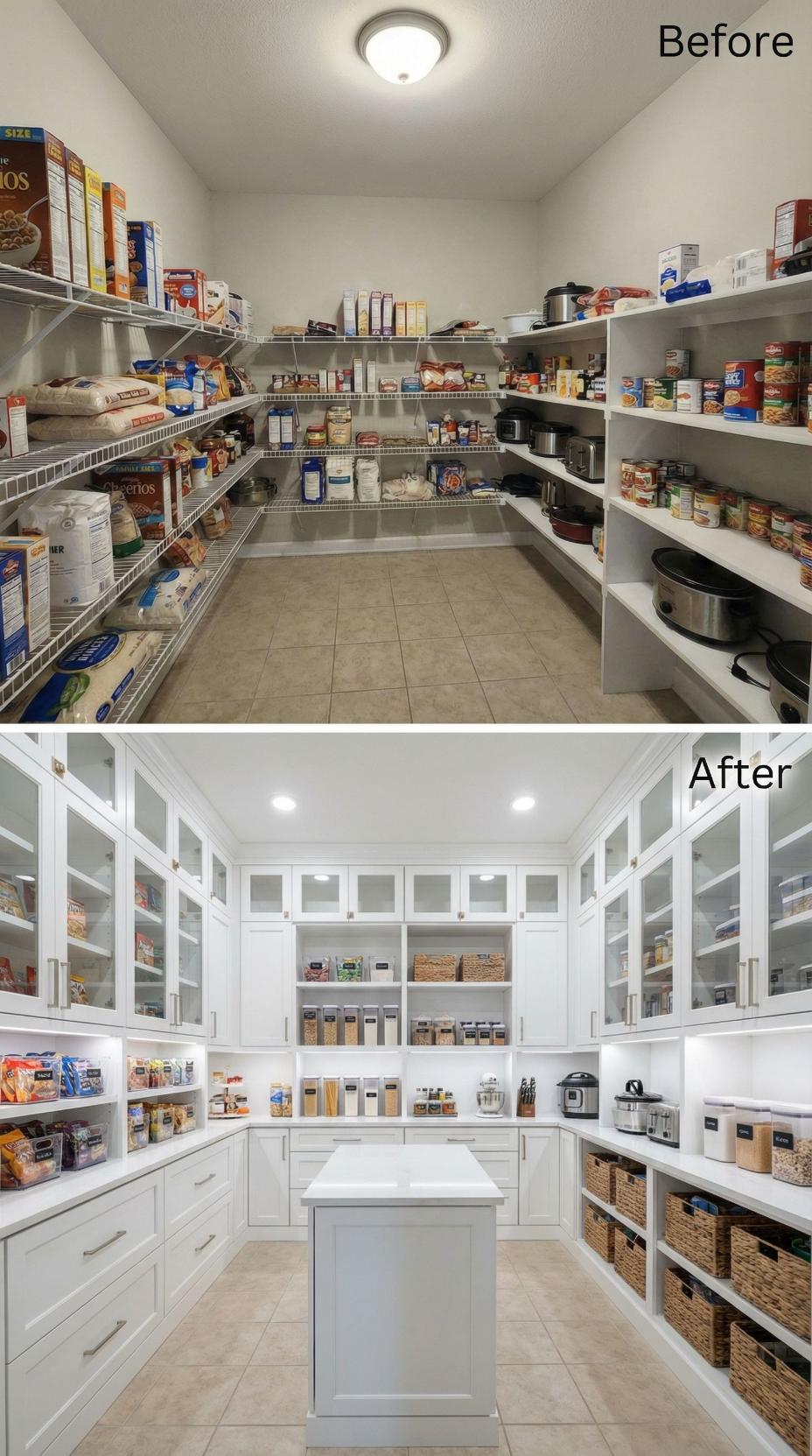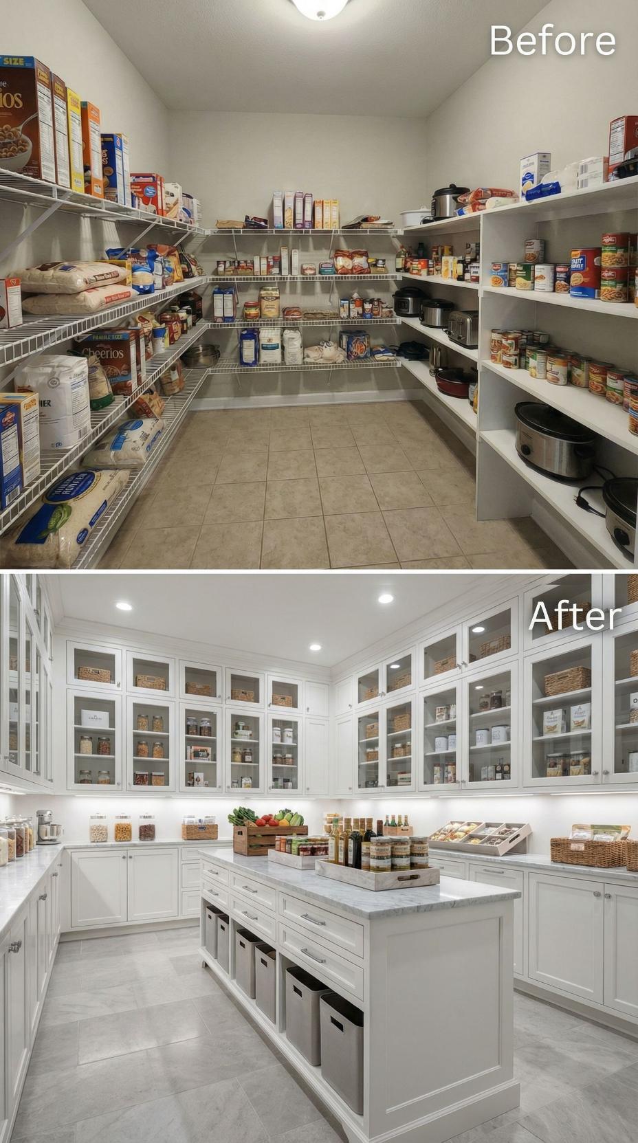 Wire shelving and cramped quarters gave way to floor-to-ceiling white shaker cabinets with glass-front doors and pristine organization. Custom built-ins maximize every inch with pull-out drawers, adjustable shelving, and dedicated zones for appliances. Bright LED lighting and a marble-topped center island create a luxurious workspace that elevates food storage into an elegant, functional room.