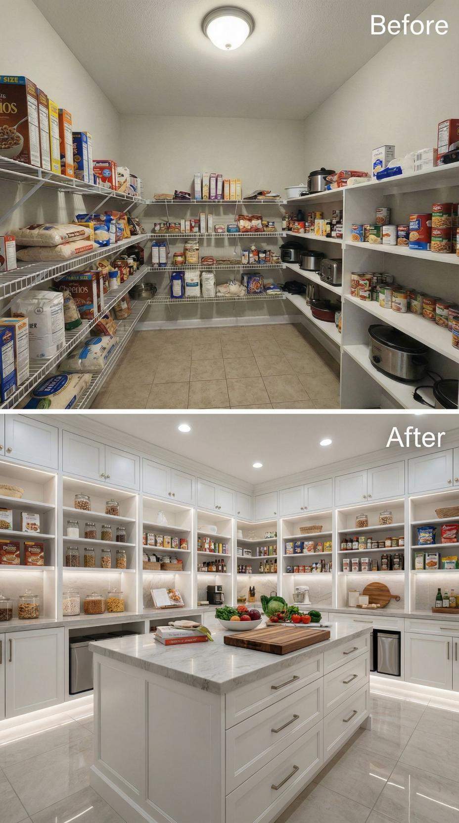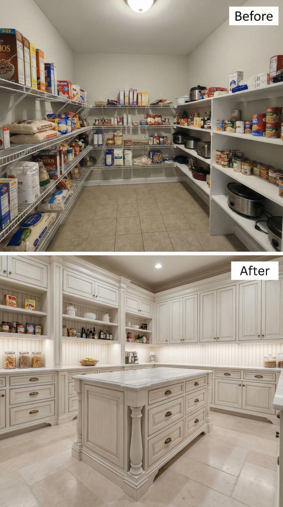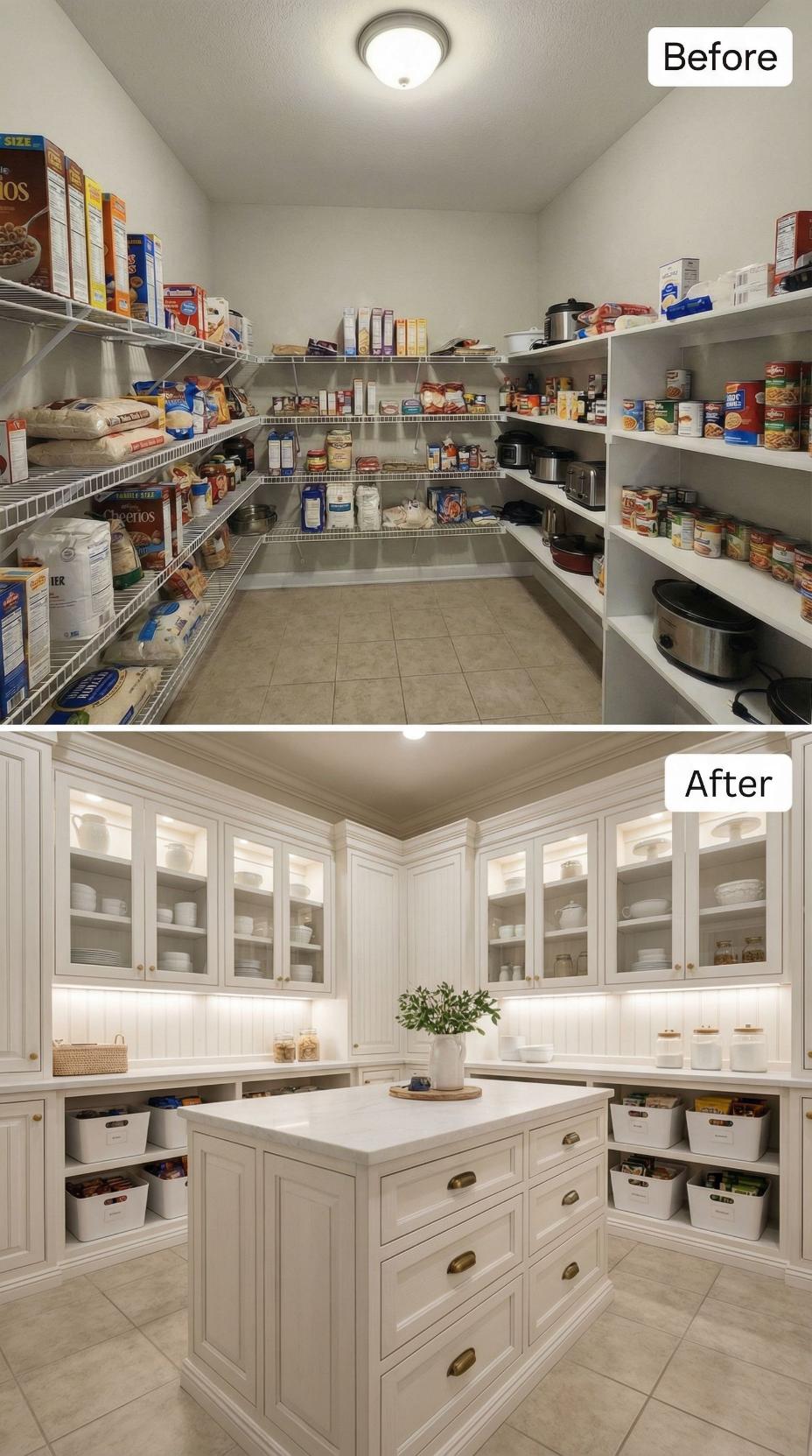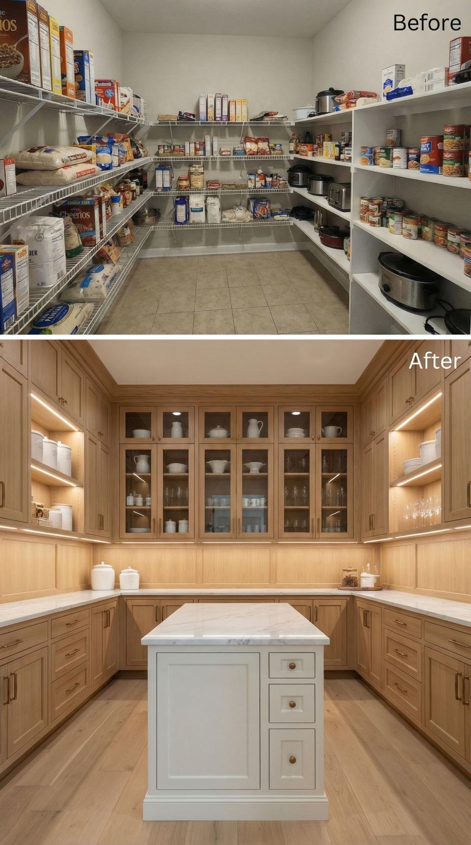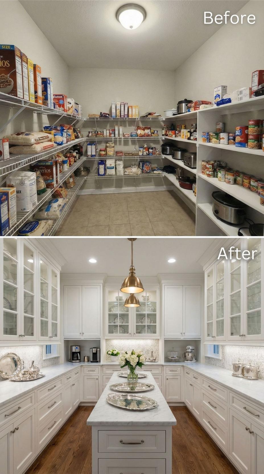 Wire shelving and cramped quarters gave way to floor-to-ceiling white shaker cabinets with glass-front doors and pristine organization. Custom built-ins maximize every inch with pull-out drawers, adjustable shelving, and dedicated zones for appliances. Bright LED lighting and a marble-topped center island create a luxurious workspace that elevates food storage into an elegant, functional room.