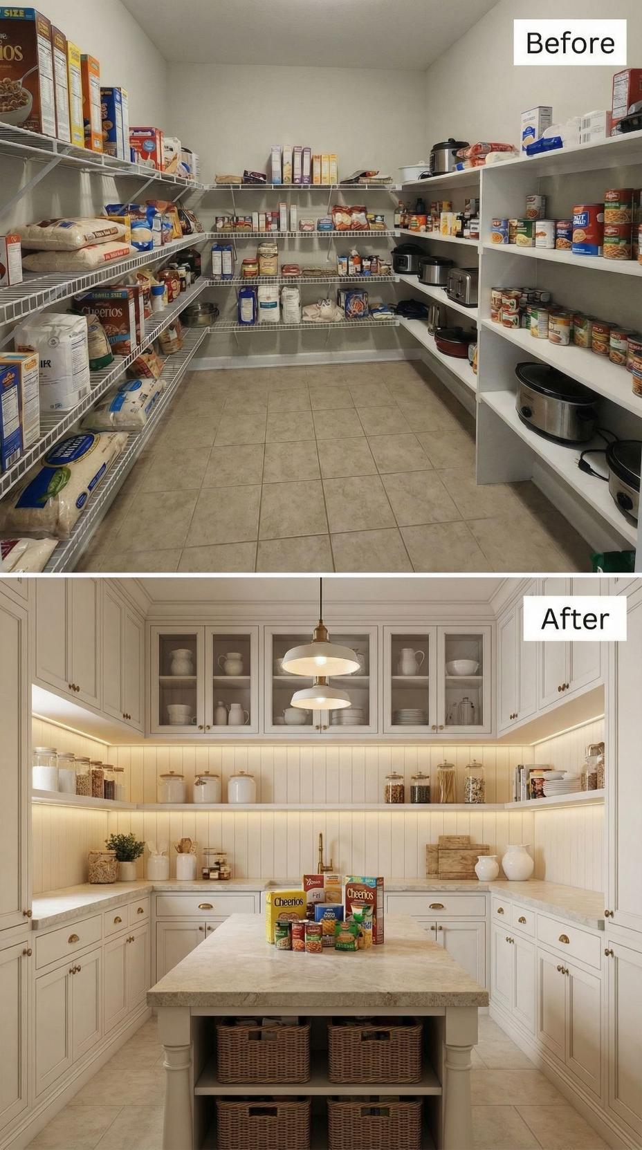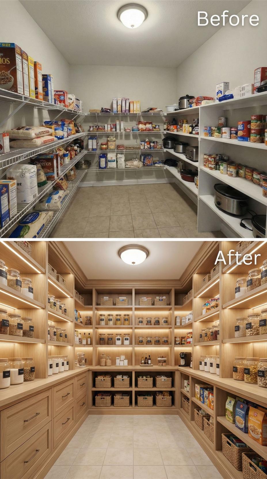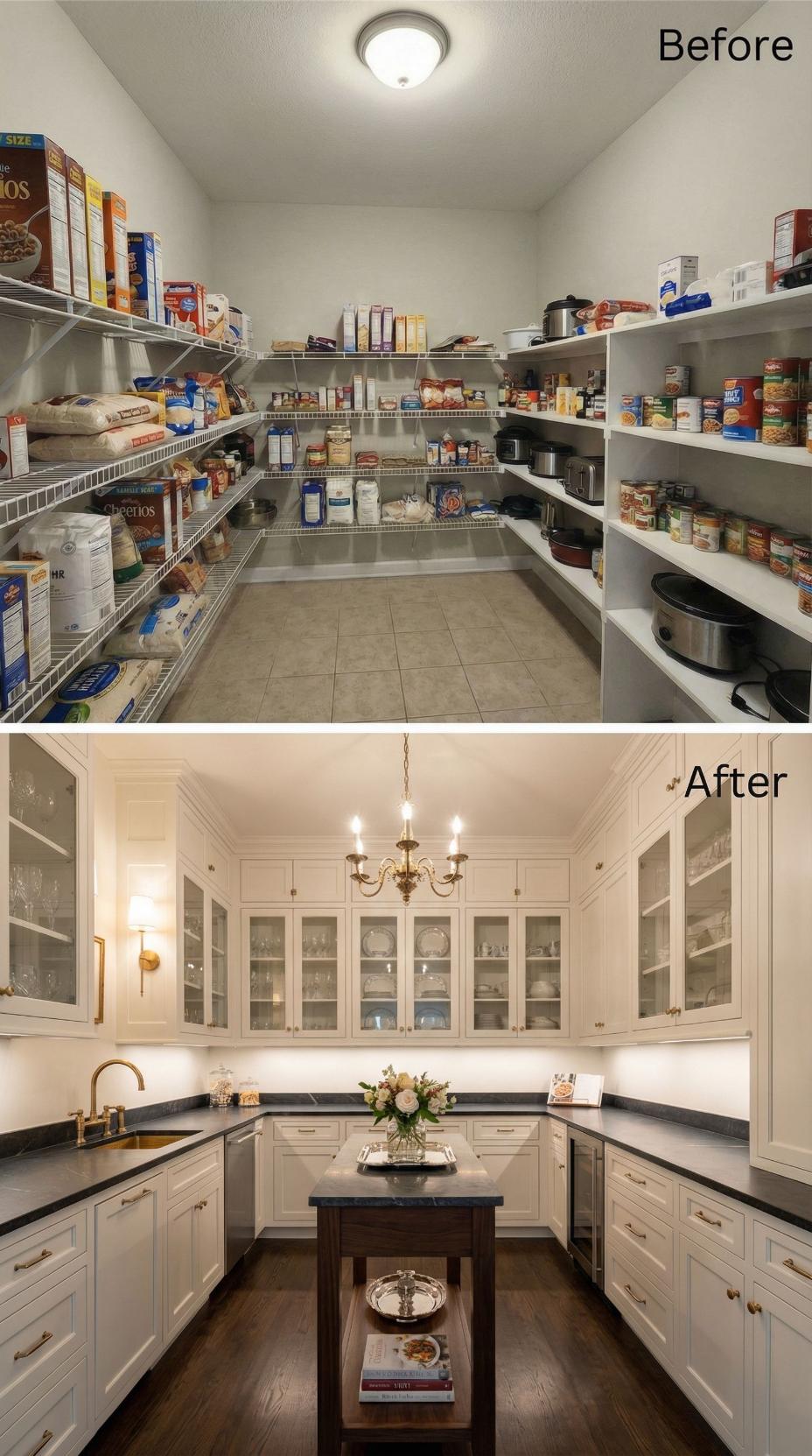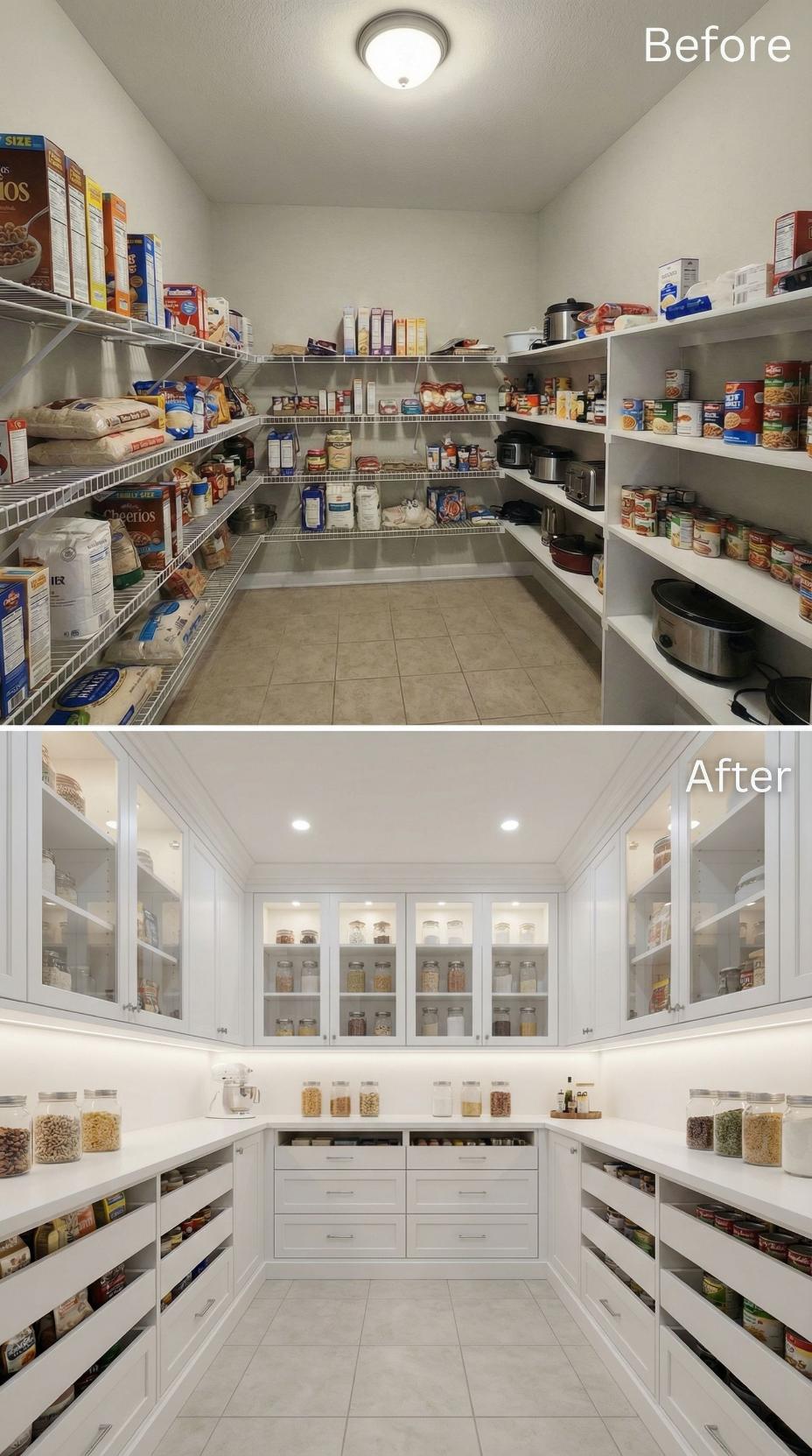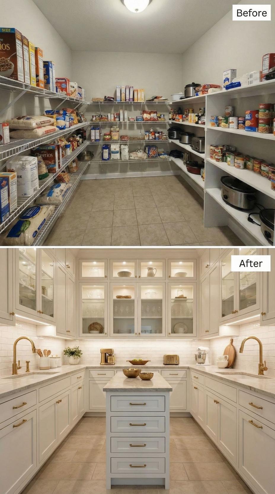 Wire shelving and cramped quarters gave way to floor-to-ceiling white shaker cabinets with glass-front doors and pristine organization. Custom built-ins maximize every inch with pull-out drawers, adjustable shelving, and dedicated zones for appliances. Bright LED lighting and a marble-topped center island create a luxurious workspace that elevates food storage into an elegant, functional room.