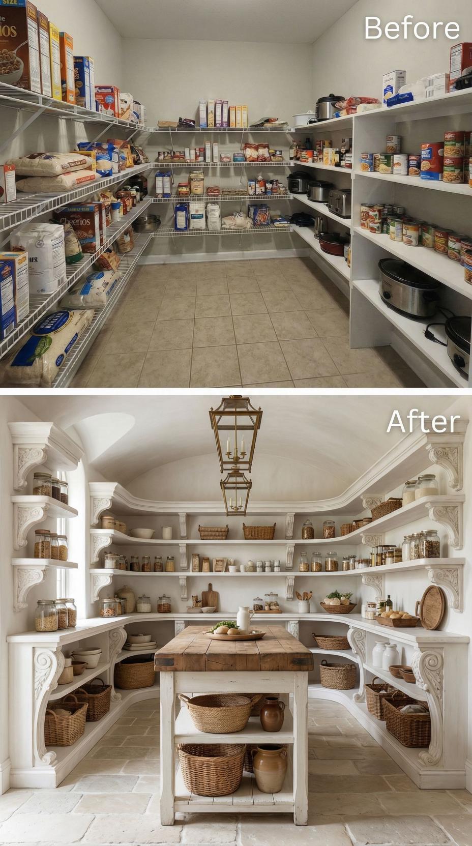 Ornate corbels and classical architectural details transform this builder grade kitchen pantry into a sophisticated European-inspired storage sanctuary. Custom white painted shelving with decorative molding replaces basic wire racks, while warm brass lantern lighting and natural wicker baskets create an upscale aesthetic. Glass jars and wooden serving pieces replace cardboard packaging for a refined pantry experience.
