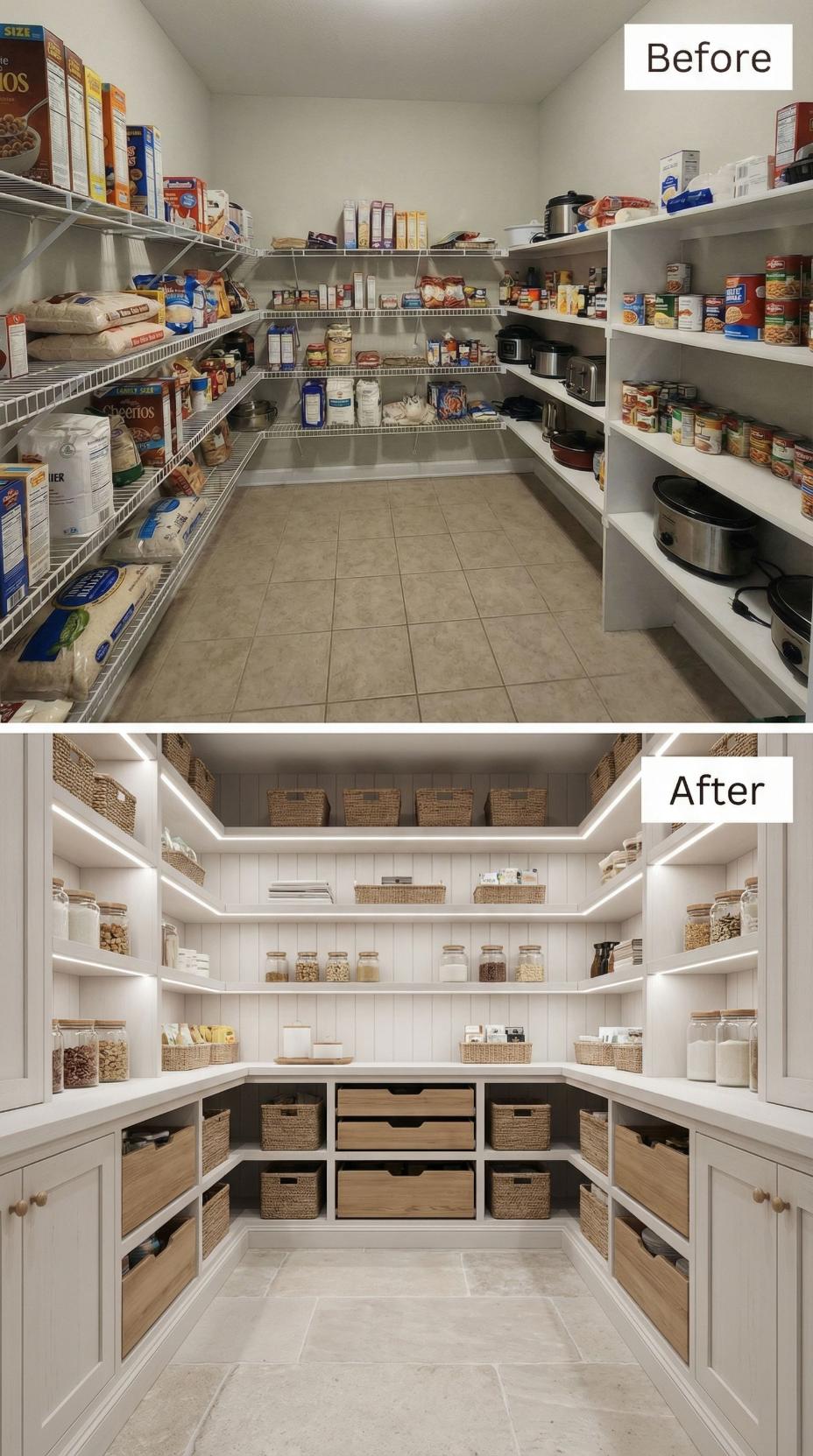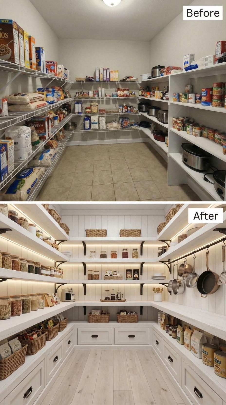 Wire shelving and mismatched containers disappear behind elegant white shiplap walls and custom cabinetry. LED strip lighting illuminates every corner while natural wicker baskets and glass storage jars create visual harmony. Lower cabinets with wooden drawers maximize floor space, transforming chaotic storage into an Instagram-worthy pantry that makes meal planning effortless and beautiful.