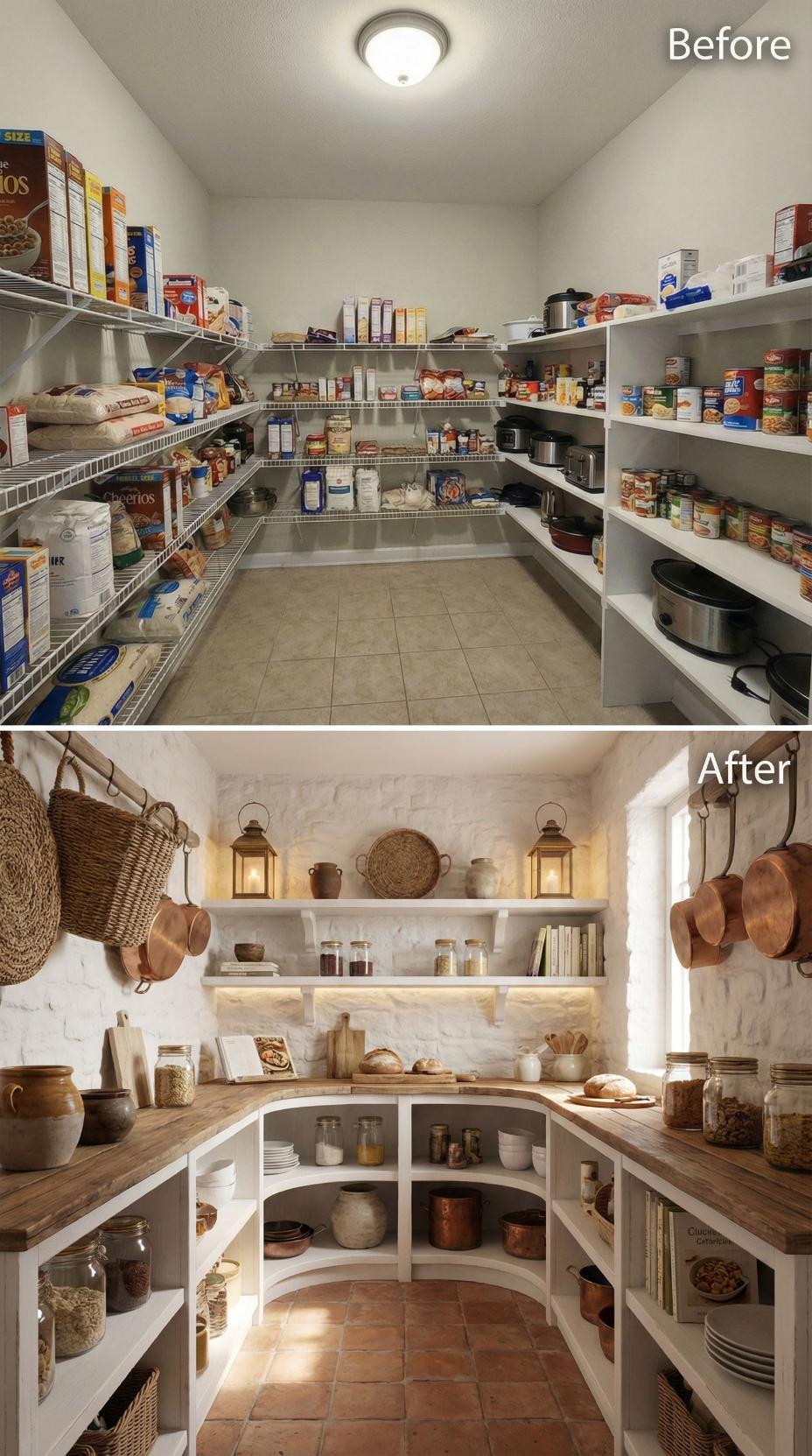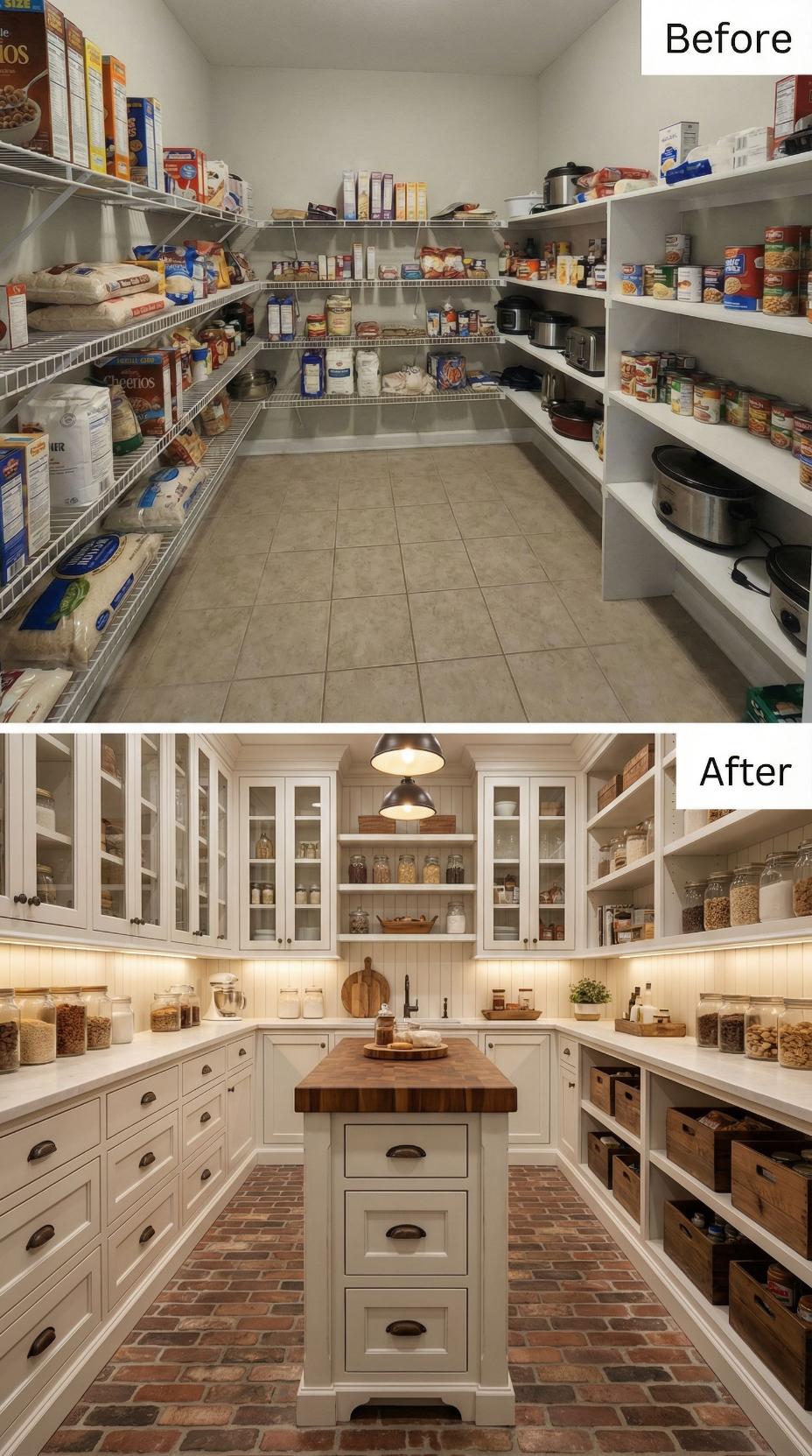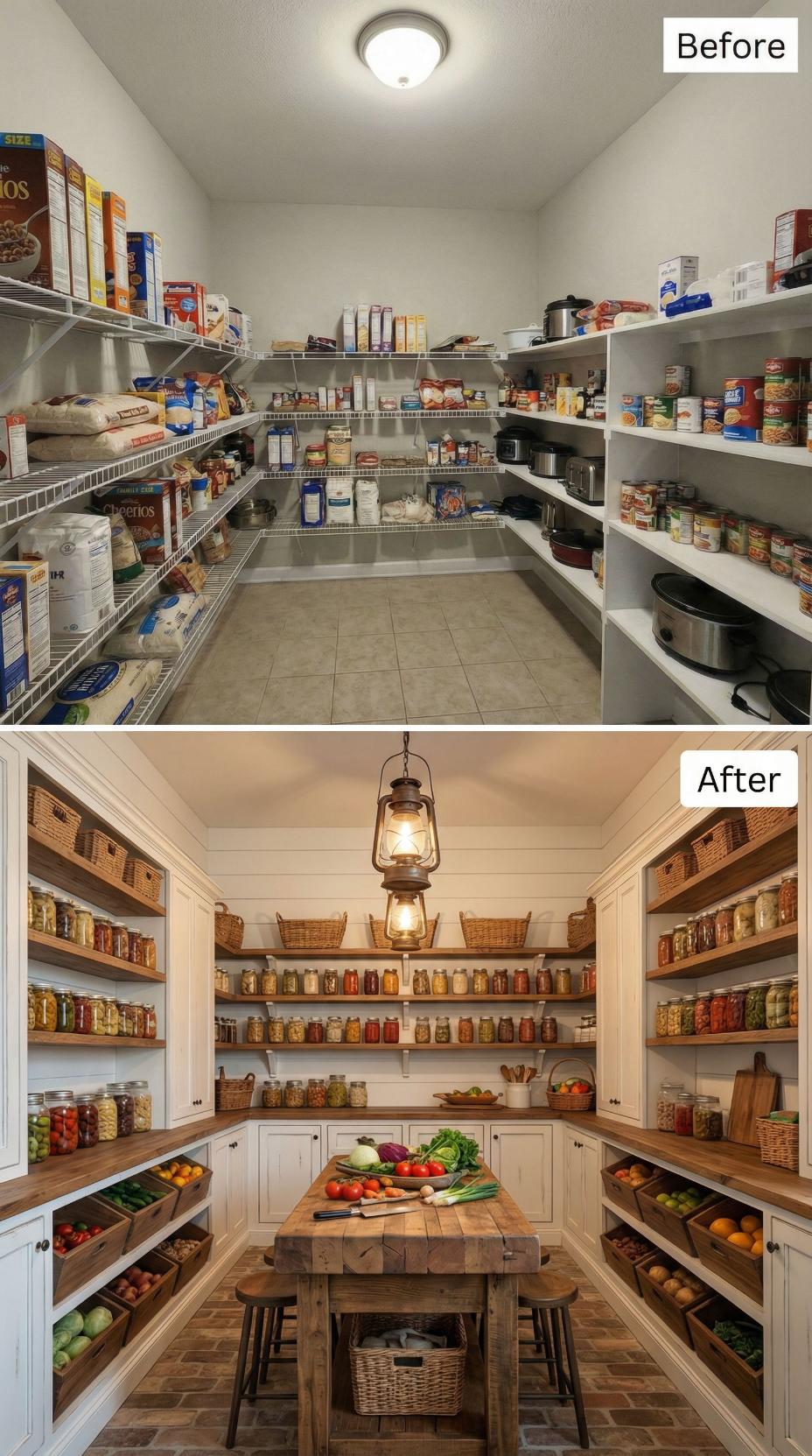 Builder grade kitchen pantry transforms into a stunning farmhouse haven through strategic upgrades and thoughtful design choices. White shaker-style cabinets replace utilitarian wire shelving, while rich wood countertops and rustic brick flooring add warmth and character. Mason jar storage, woven baskets, and vintage-inspired lantern lighting create an organized yet charming space that elevates food storage into a beautiful room worthy of showcasing.