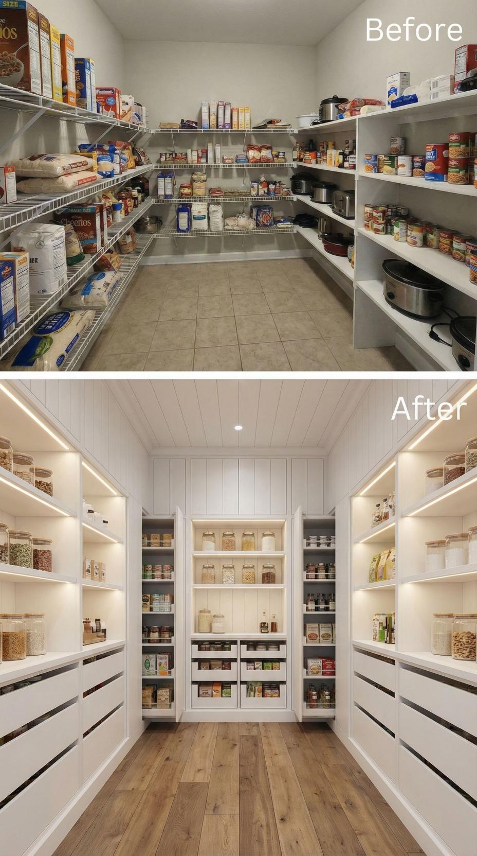 Wire shelving and basic storage transformed into sophisticated white millwork creates a stunning pantry upgrade. Custom cabinets with pull-out drawers maximize accessibility while glass containers and uniform storage elevate organization. Strategic lighting illuminates every corner, turning utilitarian space into a designer showcase. The cohesive white palette and thoughtful layout demonstrate how intentional design elevates everyday functionality into luxury storage.