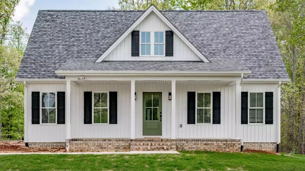 Exterior photo shows a board-and-batten farmhouse with a covered porch; floor plan below reveals the main-level layout, including primary bedroom, family room, kitchen, and garage.