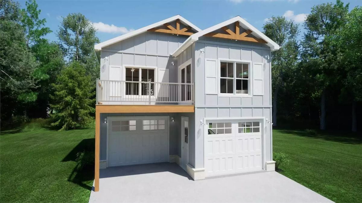This home features a modern cottage-style exterior with clean vertical siding, exposed gable accents, and an upper-level balcony that adds character and dimension. Dual garage bays on the lower level are neatly integrated, creating a practical and well-balanced front elevation.